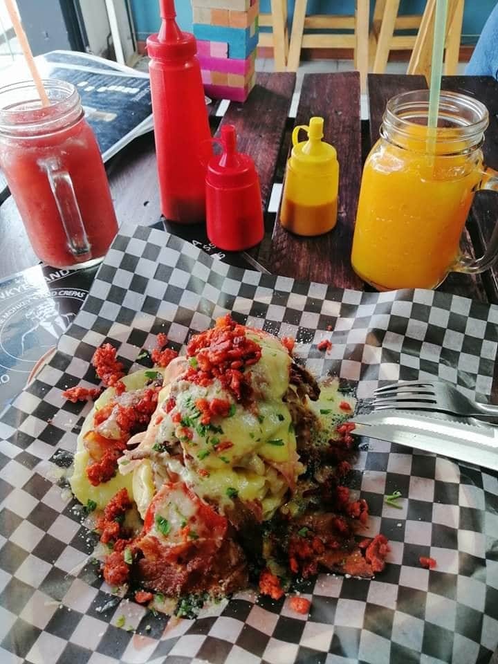Base de cafe, crema batida, chocoretas, krankys, bubulubu, panditas, chocolate liquido.