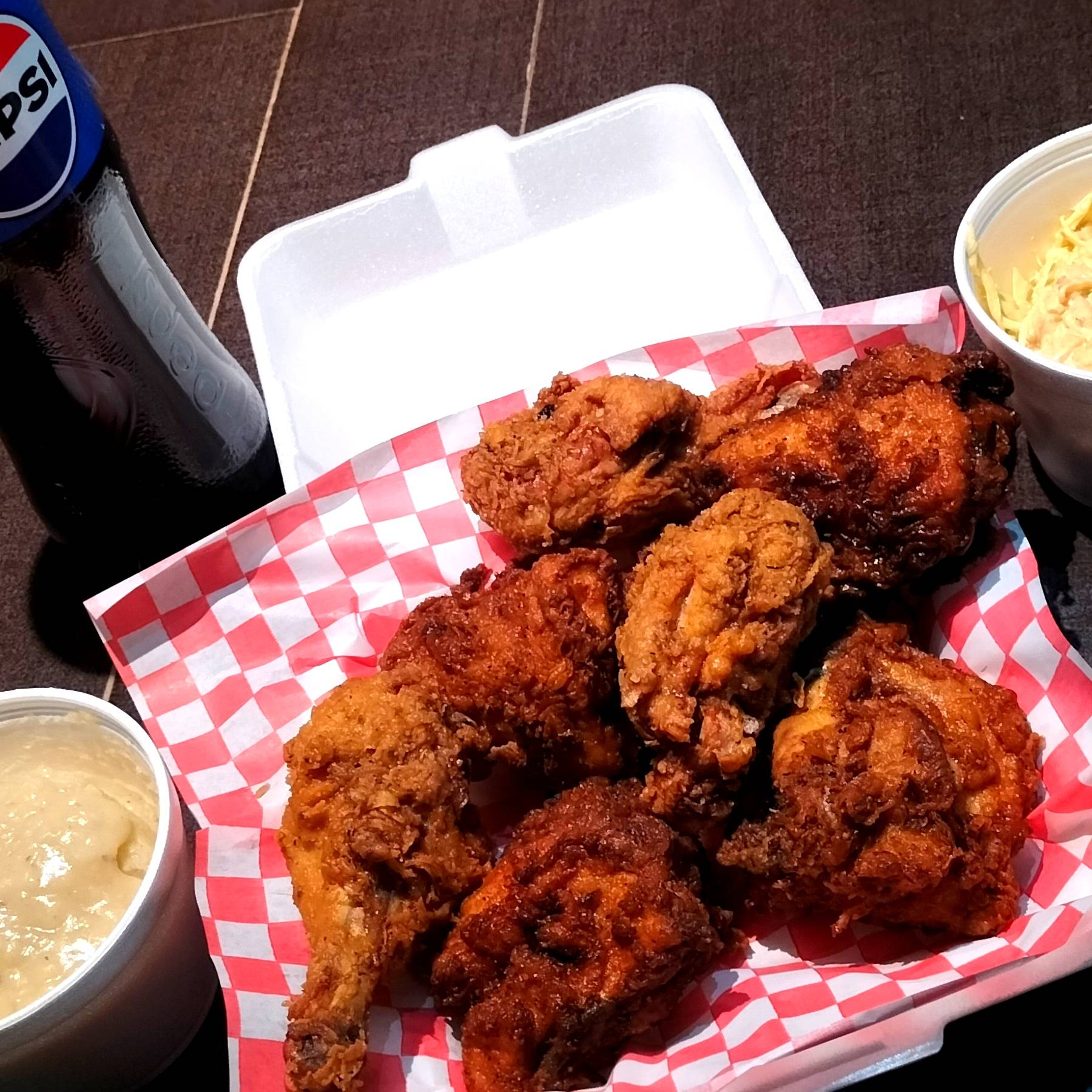 8 piezas de pollo, complemento de puré de papa, ensalada de col grande, 2 bisquets, refresco grande.