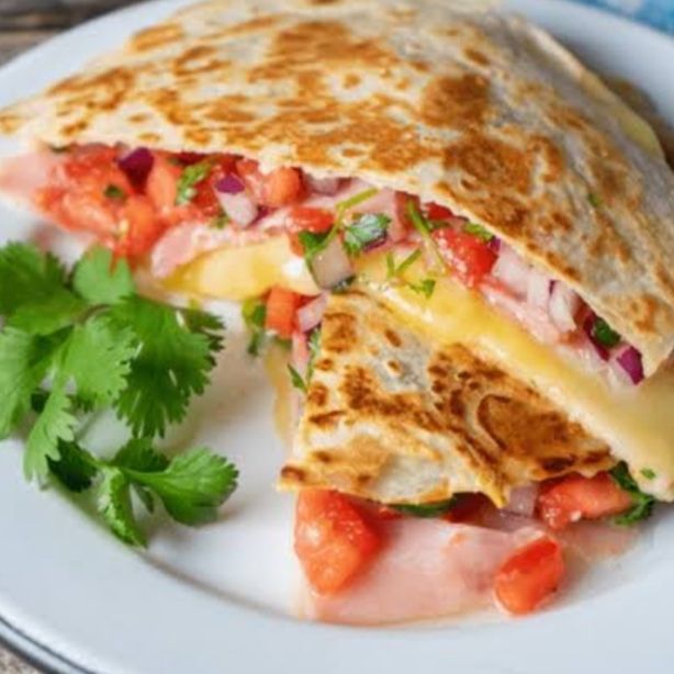 Tortilla de harina, queso Oaxaca, queso amarillo, jamón, salchicha, jitomate, cebolla, chile verde, cátsup, crema, lechuga