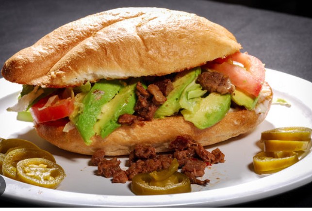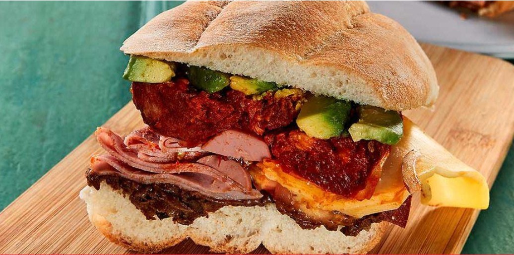 Base de frijoles, milanesa, huevo, jamón, salchicha, queso de puerco, queso Oaxaca, queso amarillo y por último queso adobera asado a la plancha en la tapa.