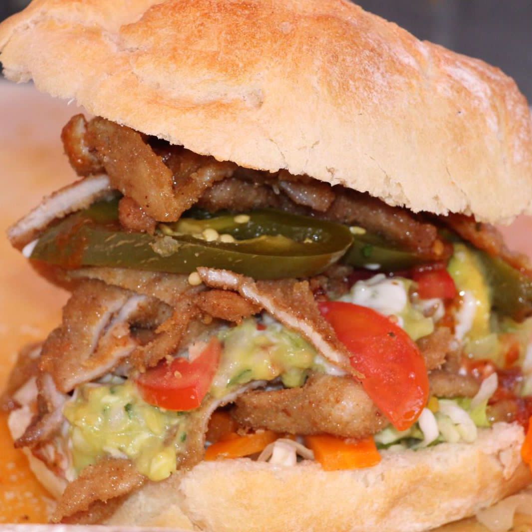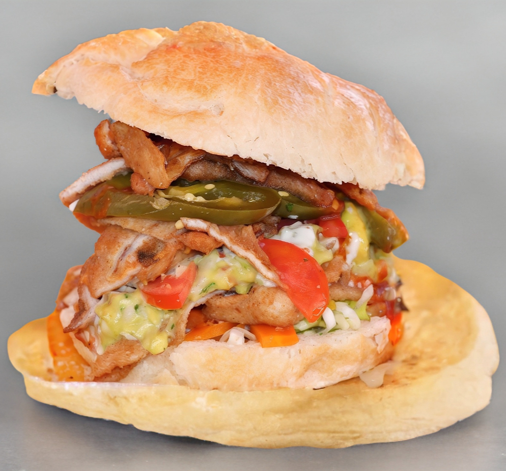Lleva lechuga, zanahoria, jalapeño, jitomate, cebolla, guacamole, y salsa.