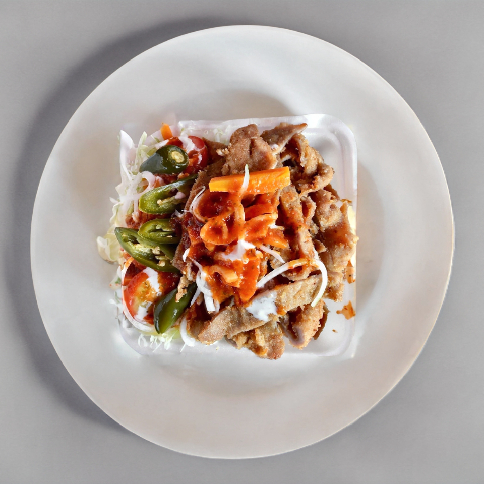 Lechuga, zanahoria, cebolla, jitomate, salsa, crema, jalapeño, frijoles y guacamole.