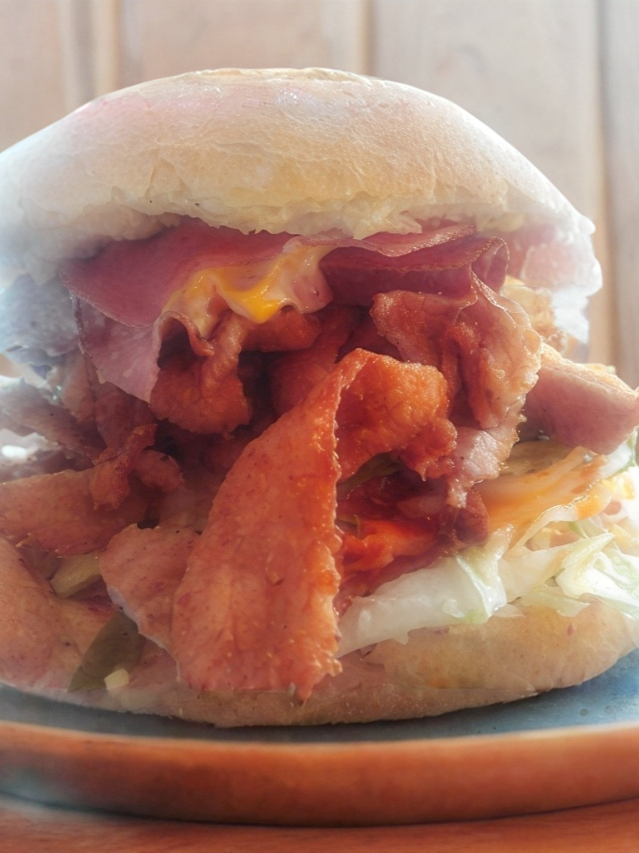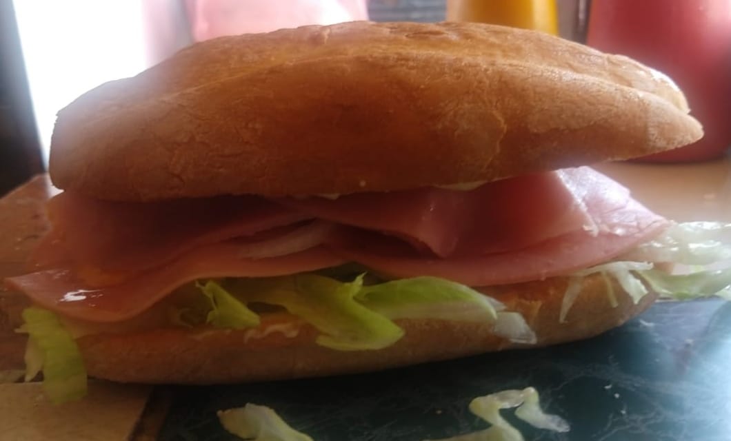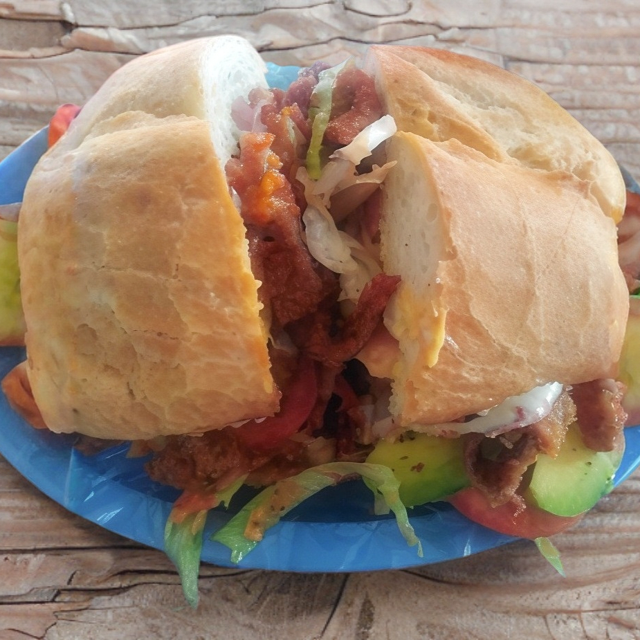 Una deliciosa torta cubana con milanesa, 1salchicha, jamón, queso Oaxaca y queso amarillo, todo dentro de un bolillo suave.