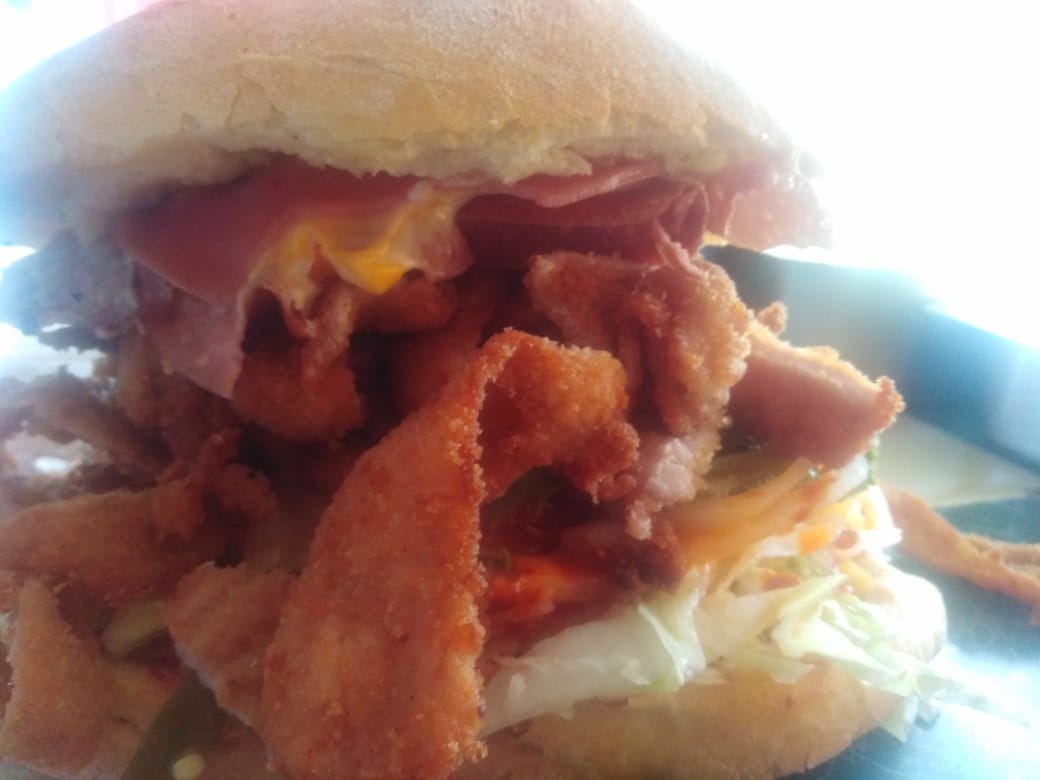 Con milanesa, salchicha, jamón, piña, queso oaxaca y queso amarillo.