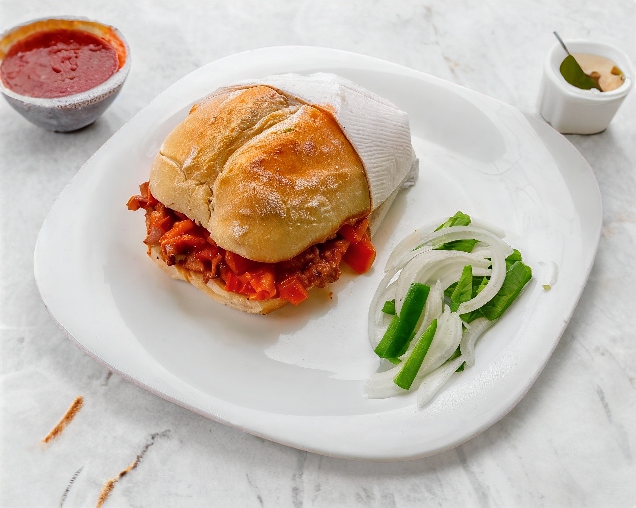 Mayonesa, mostaza, crema, lechuga, jitomate, zanahoria, milanesa, queso de puerco y queso amarillo.