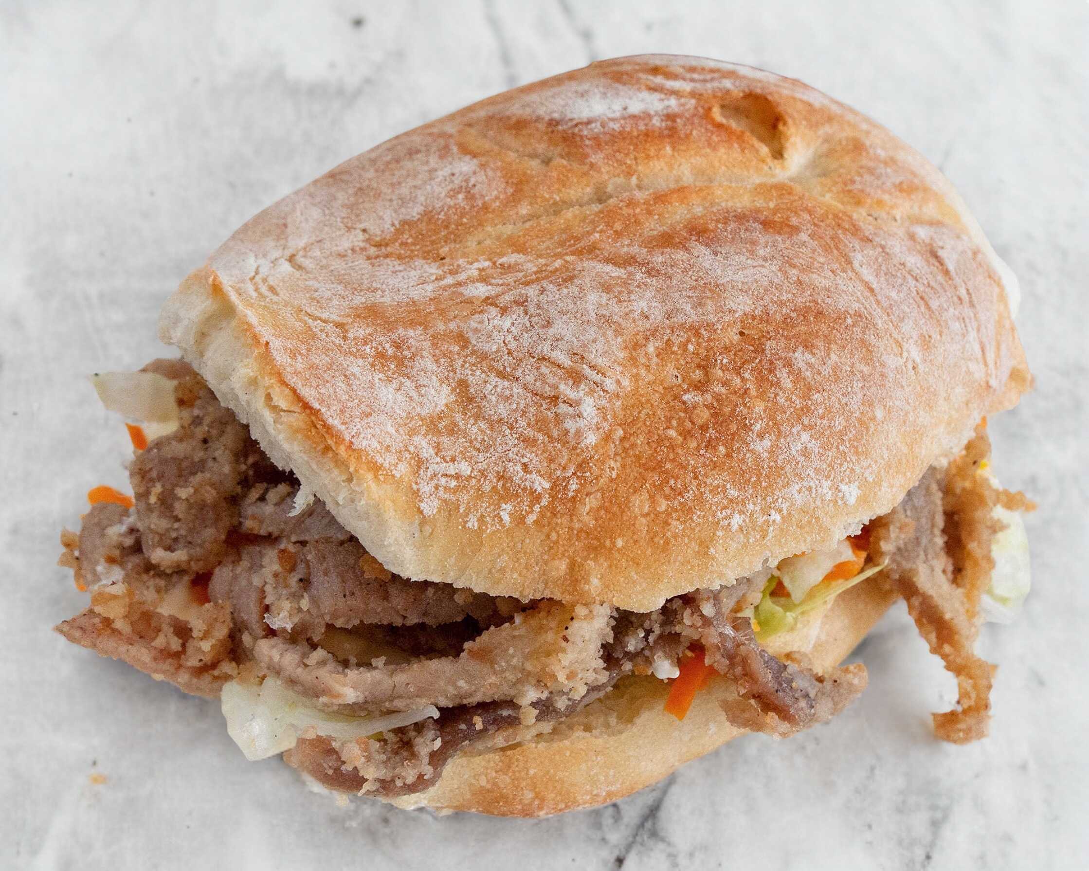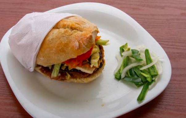 Mayonesa, mostaza, crema, lechuga, jitomate, zanahoria, milanesa, queso de puerco y queso amarillo.