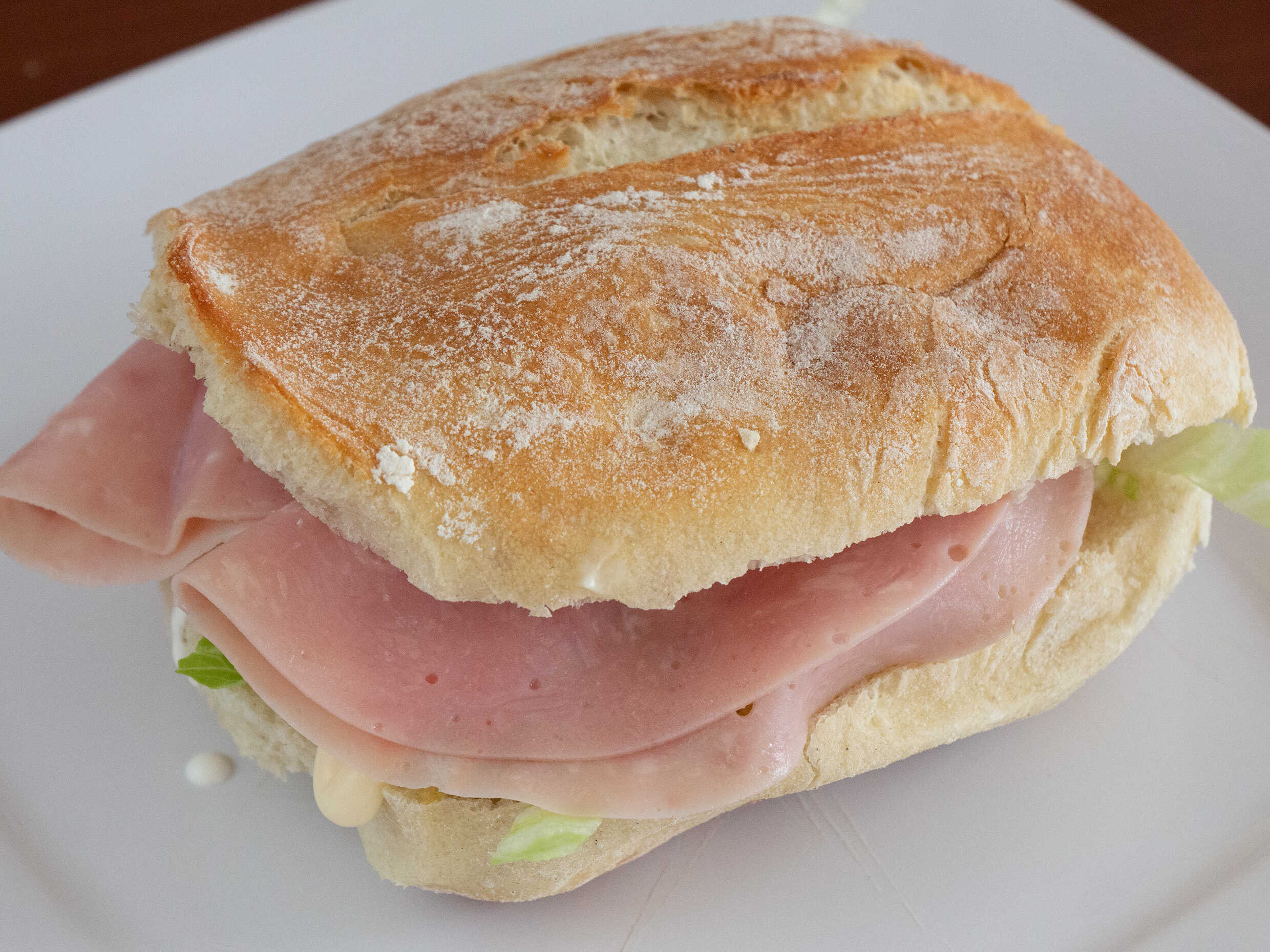 Pan telera relleno con mayonesa, mostaza, crema, lechuga, jitomate, zanahoria, 2 rebanadas de jamón, 1 rebanada de queso amarillo y chile en vinagre.