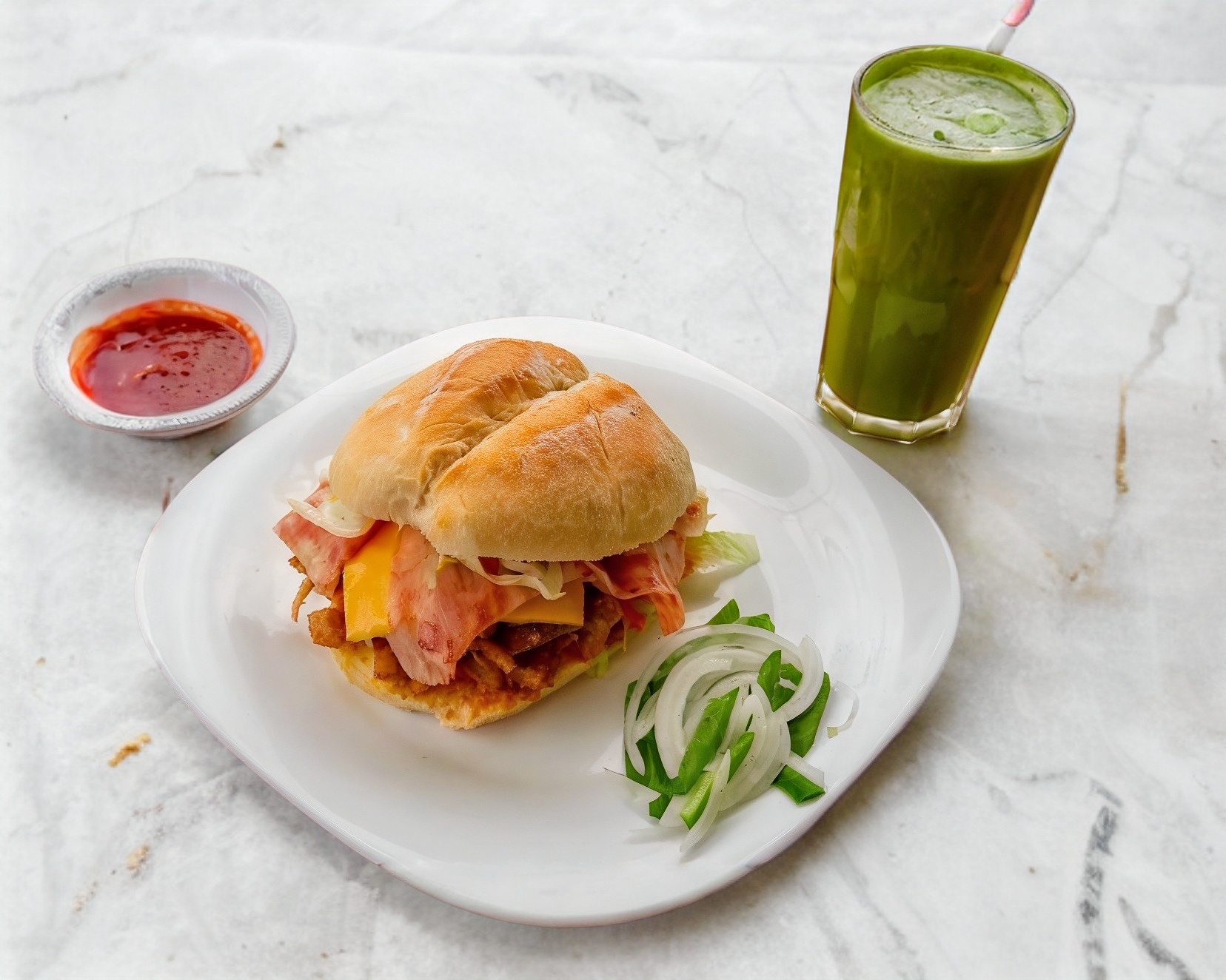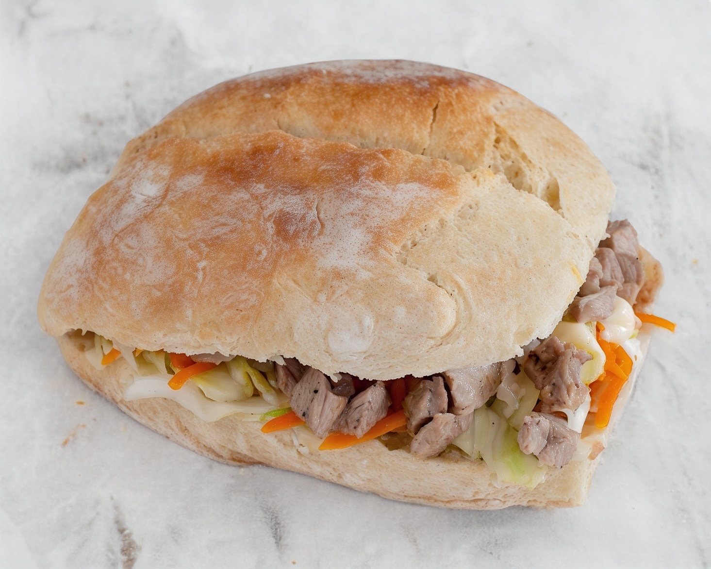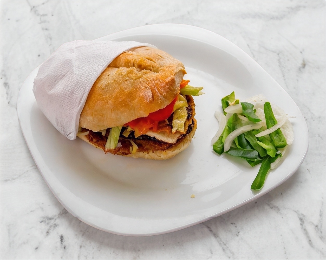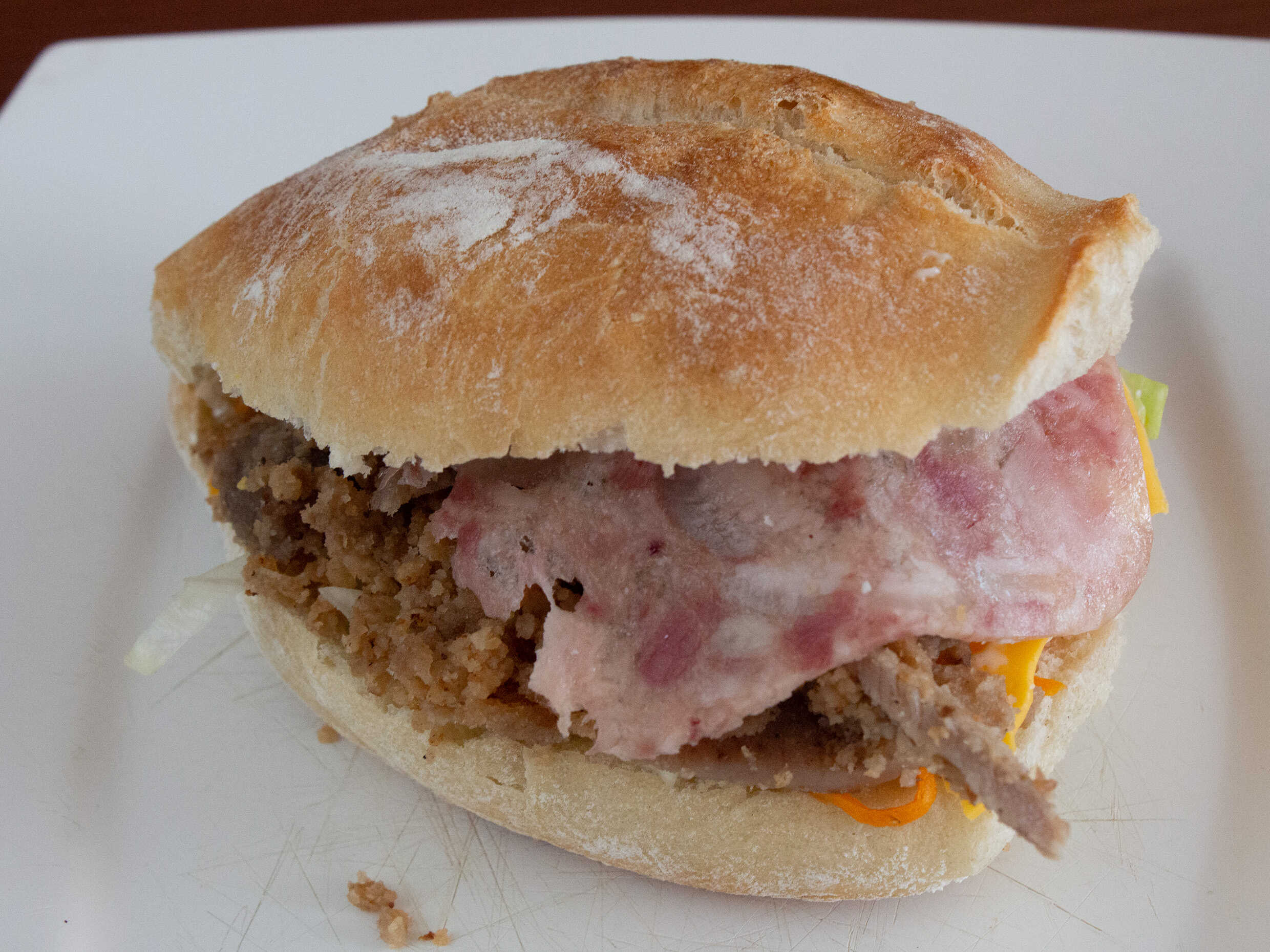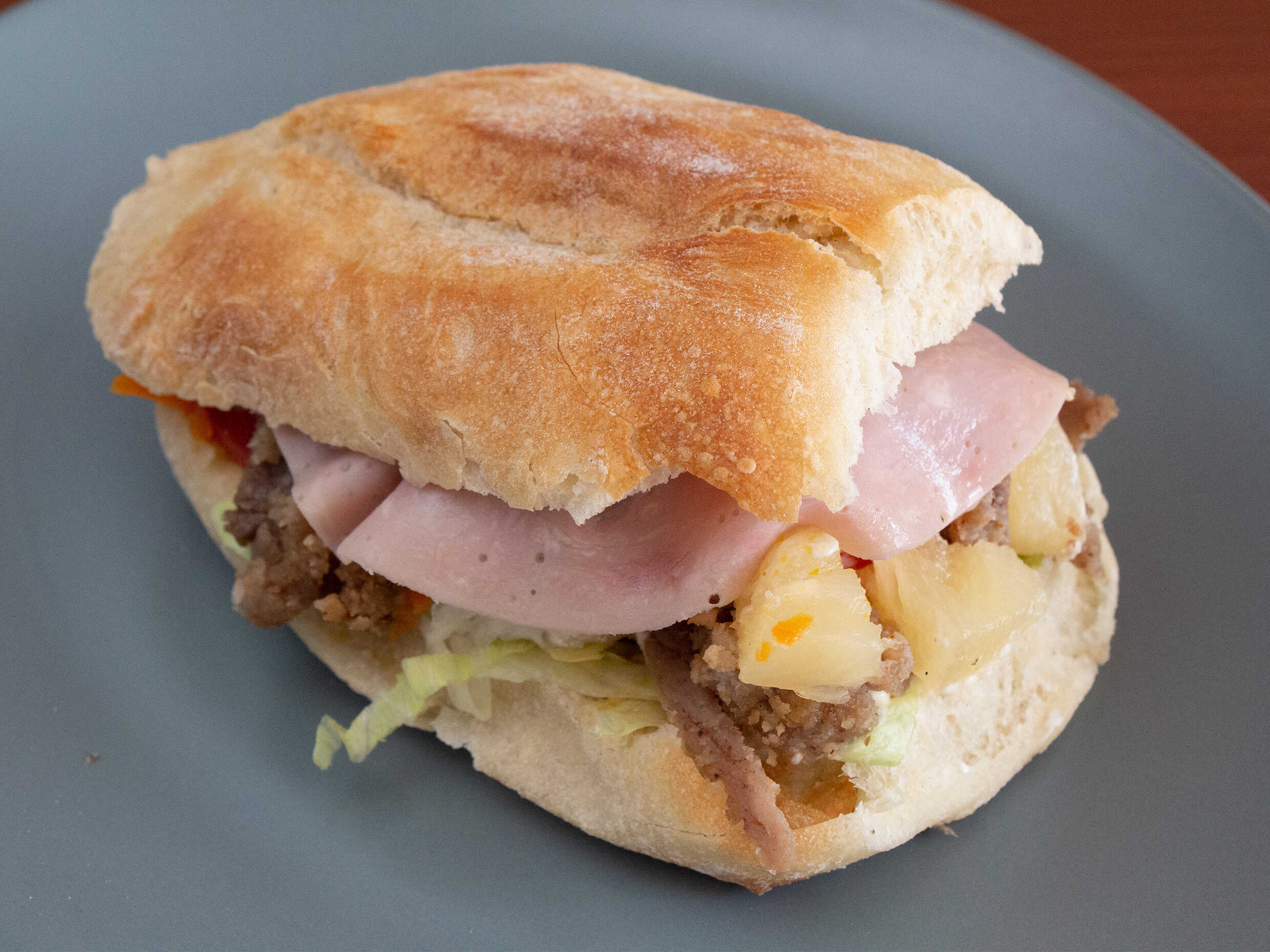 Pan telera relleno de mayonesa, mostaza, crema, lechuga, jitomate, zanahoria, milanesa, jamón, piña en almíbar.