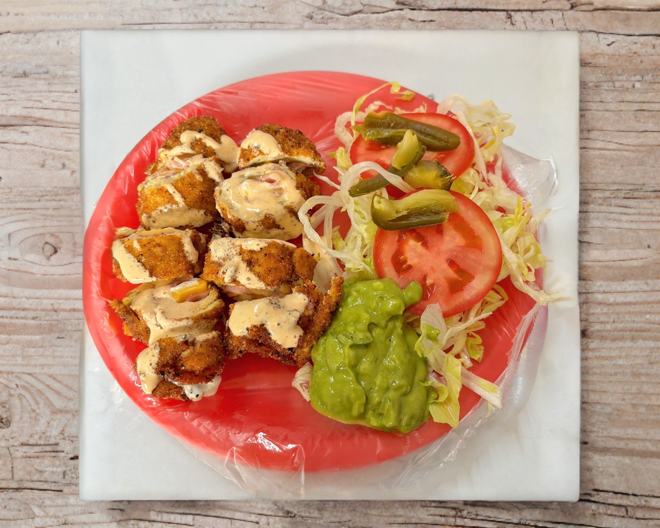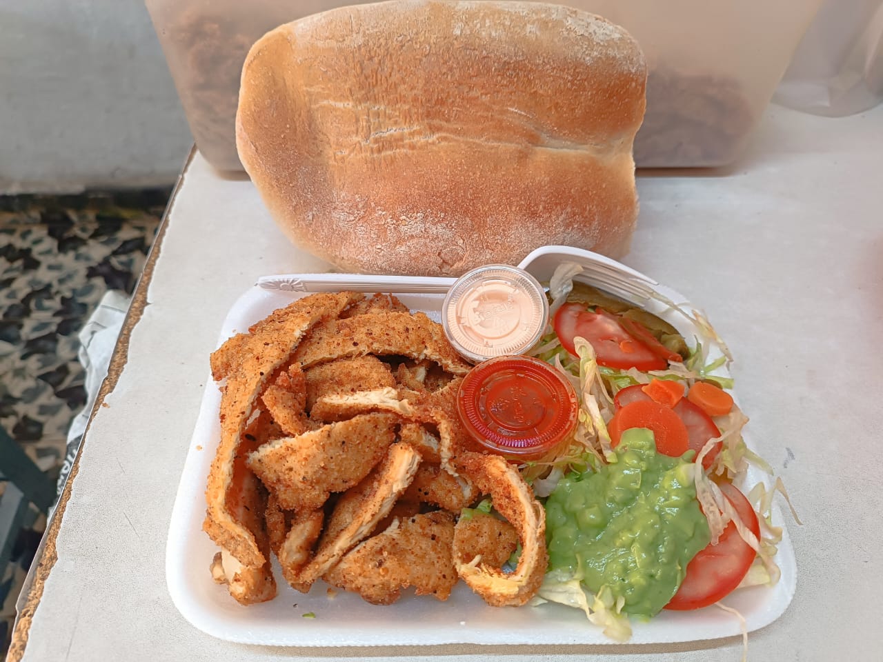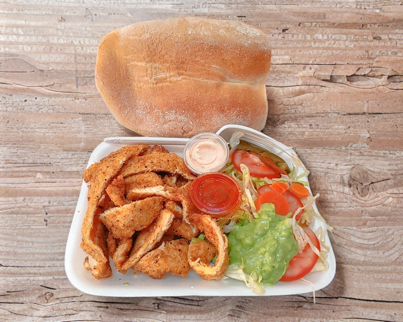 orden de milanesa de pollo 225 grs peso en crudo , guacamole, chiles en vinagre, jitomate , salsa , aderezo y bolillo aparte
