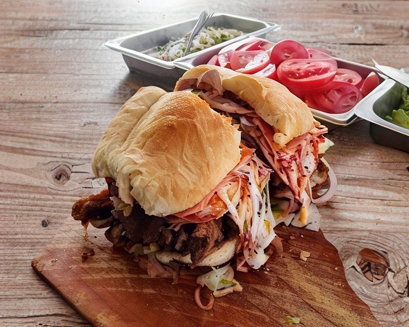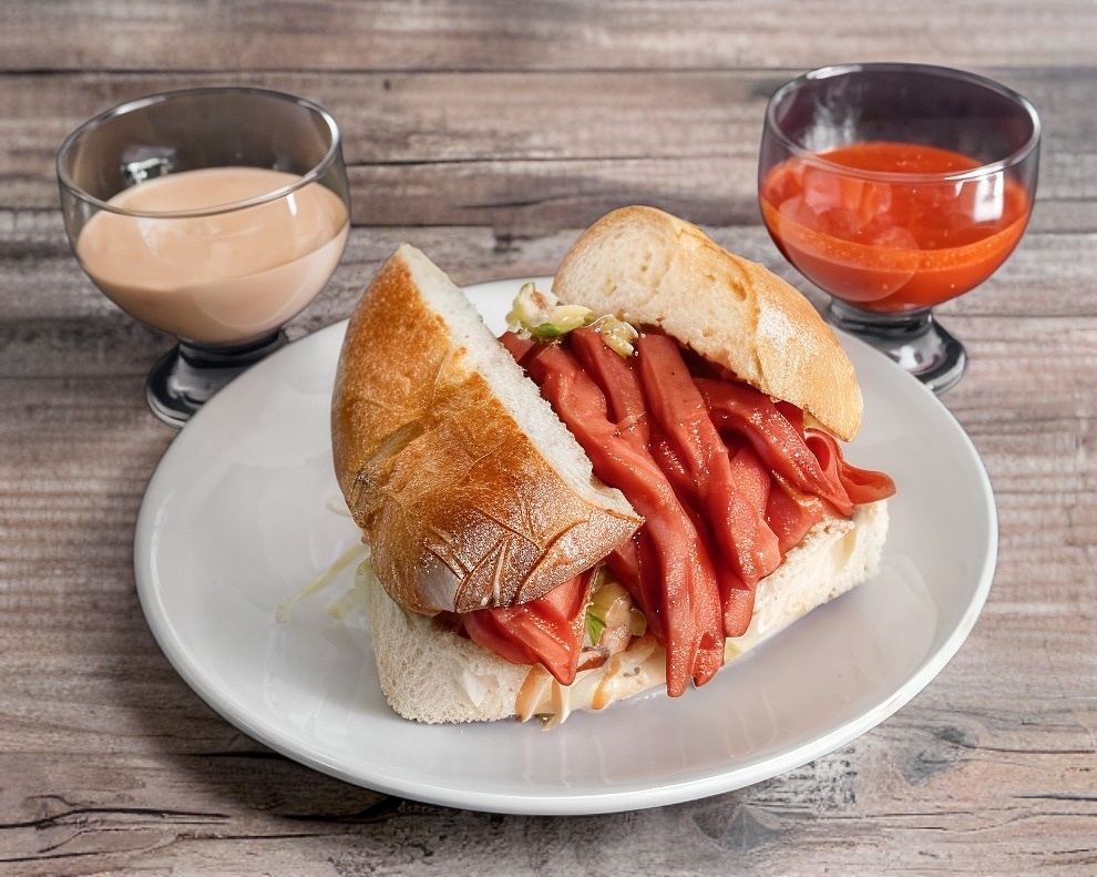 Milanesa, salchicha, jamón, queso puerco, queso amarillo, queso manchego. Lechuga, jitomate, guacamole, chile jalapeño, mayonesa y salsa. para una persona
