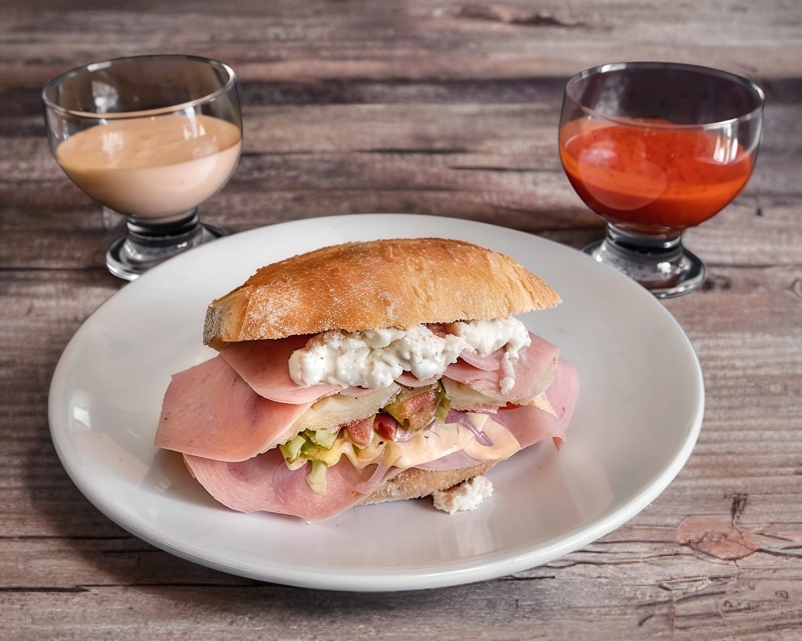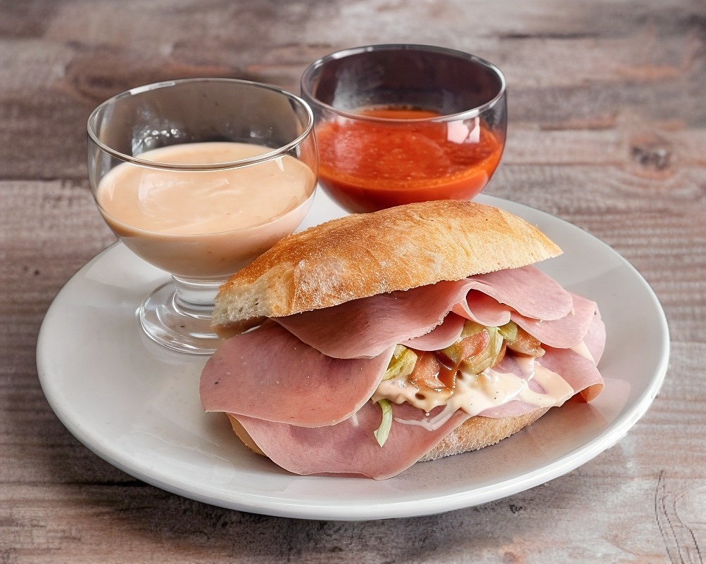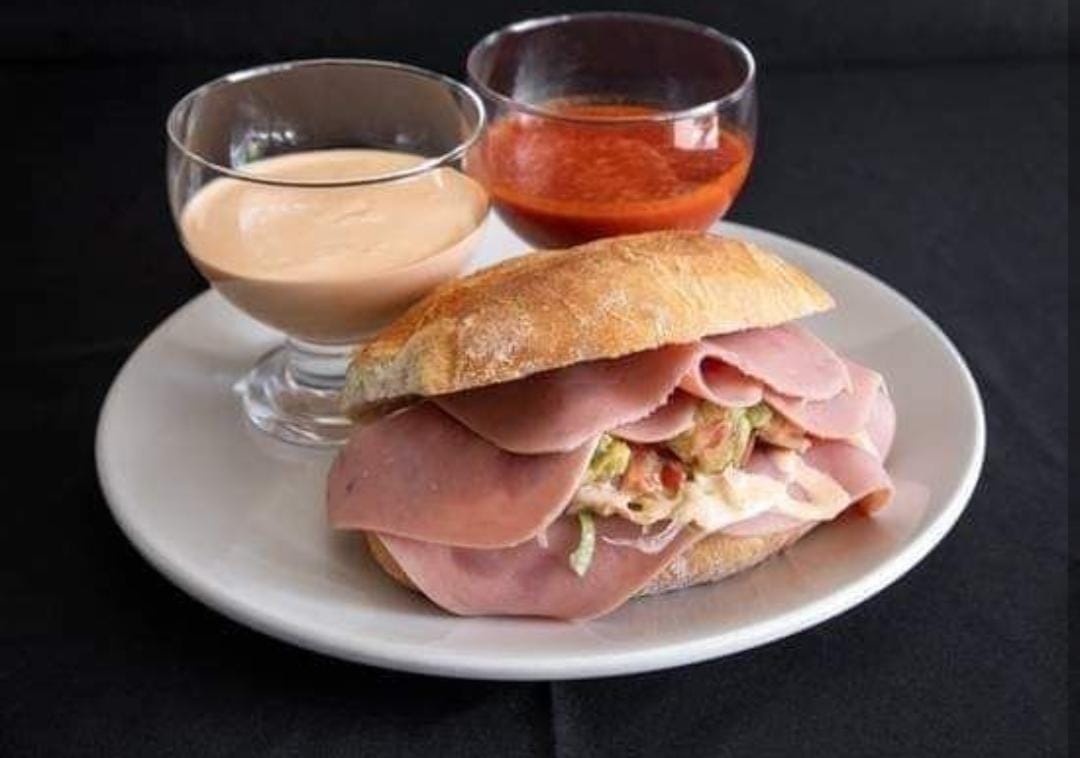 Jamón, queso manchego y piña. Lechuga, jitomate, guacamole, chile jalapeño, mayonesa y salsa.
