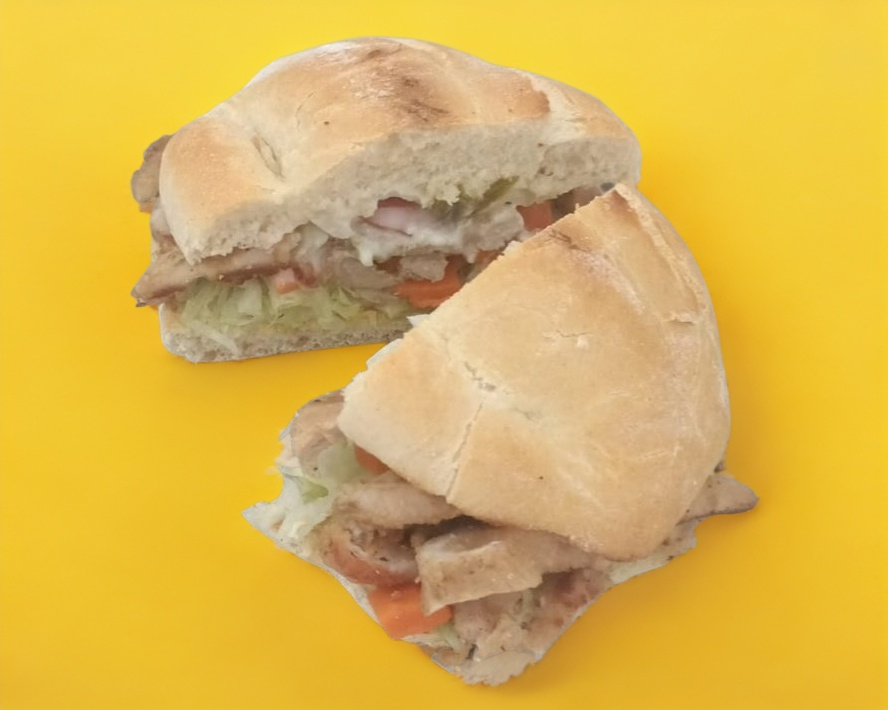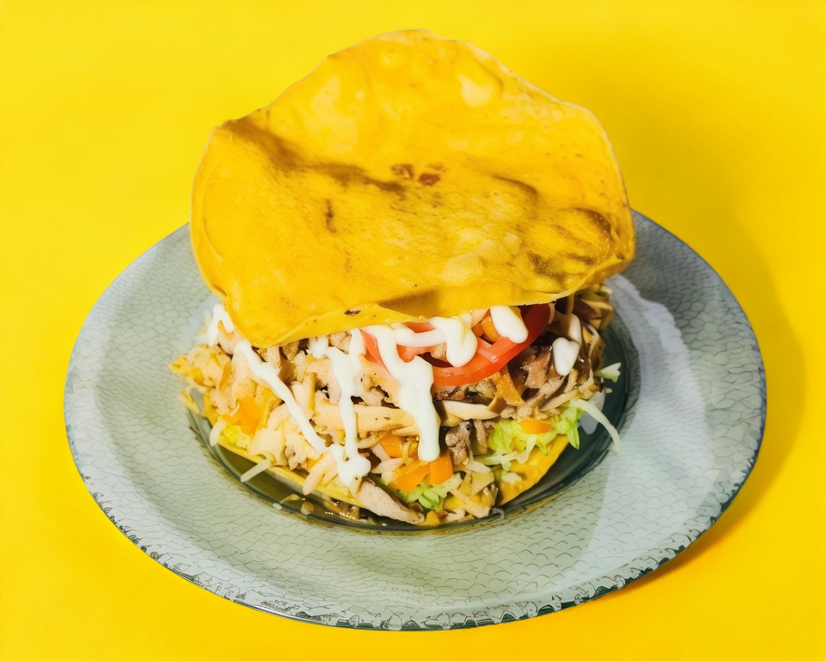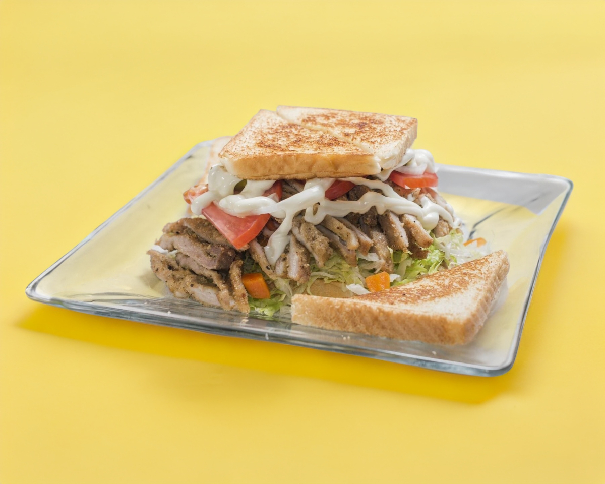 Mayonesa, lechuga, jamón 90 g, milanesa de pollo 80 g, queso amarillo 40 g, tocino 30 g y ensalada.