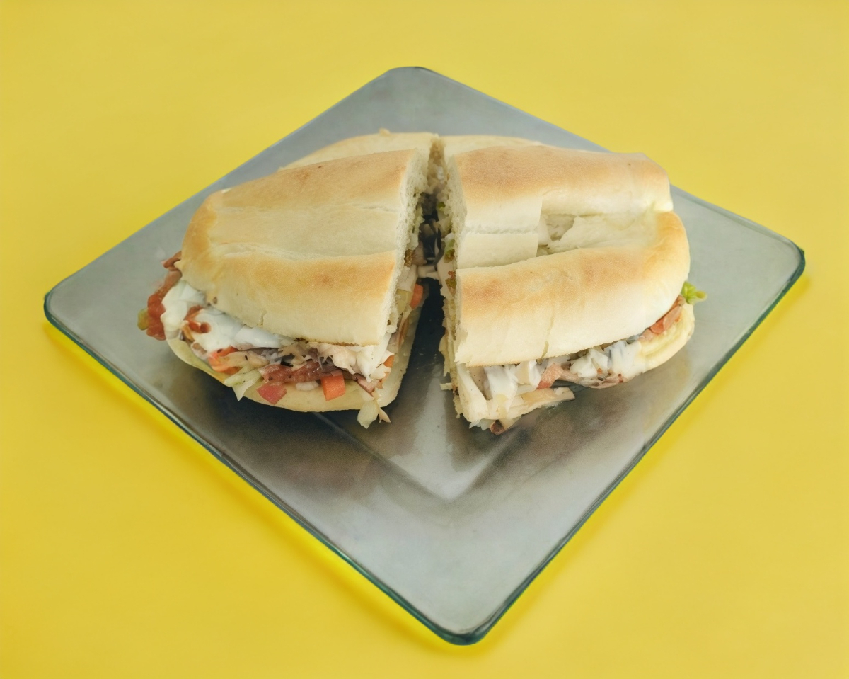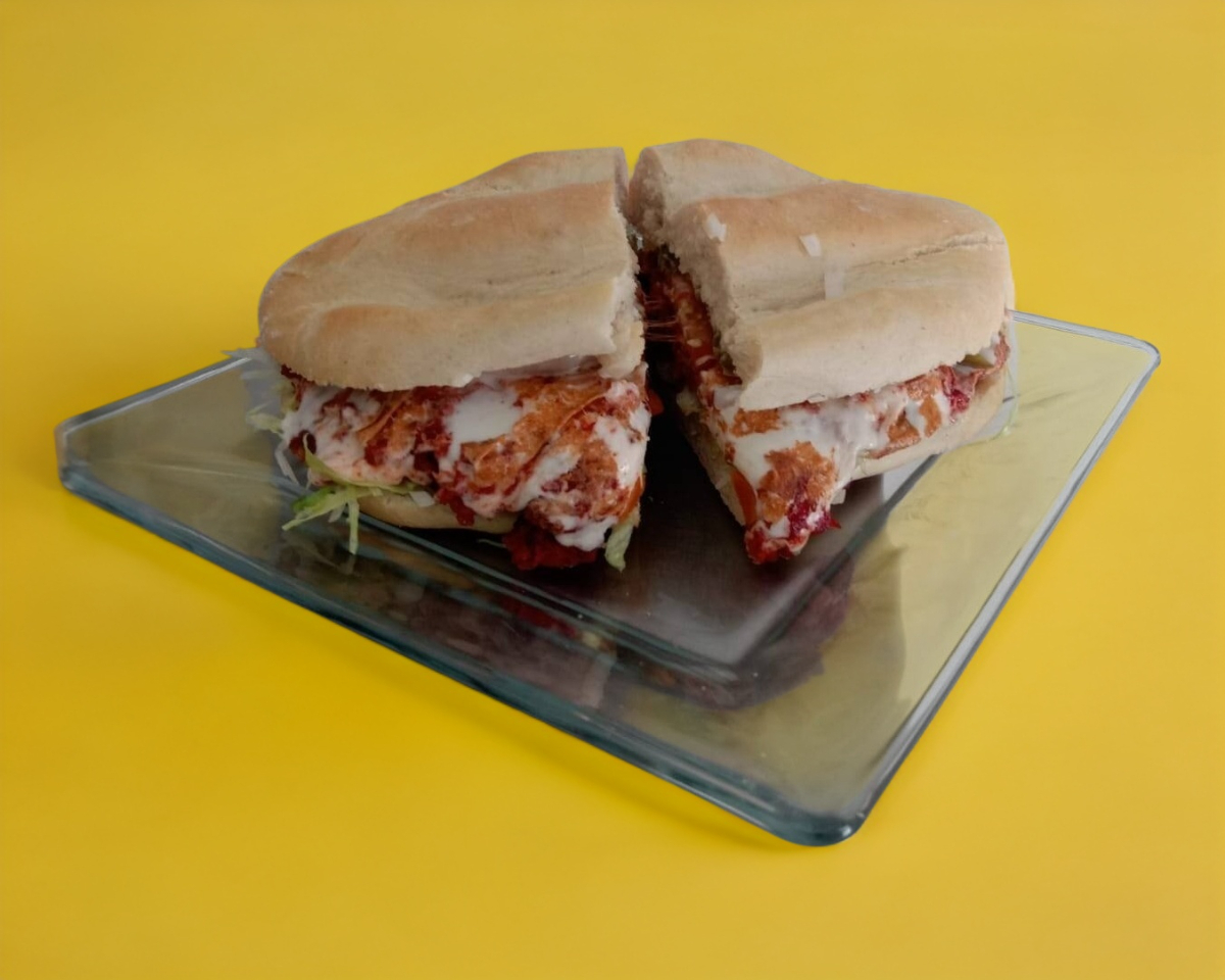 Milanesa de pollo 250 g, mostaza, lechuga, zanahoria en vinagre, chile jalapeños, jìtomate, cebolla, crema y aguacate.