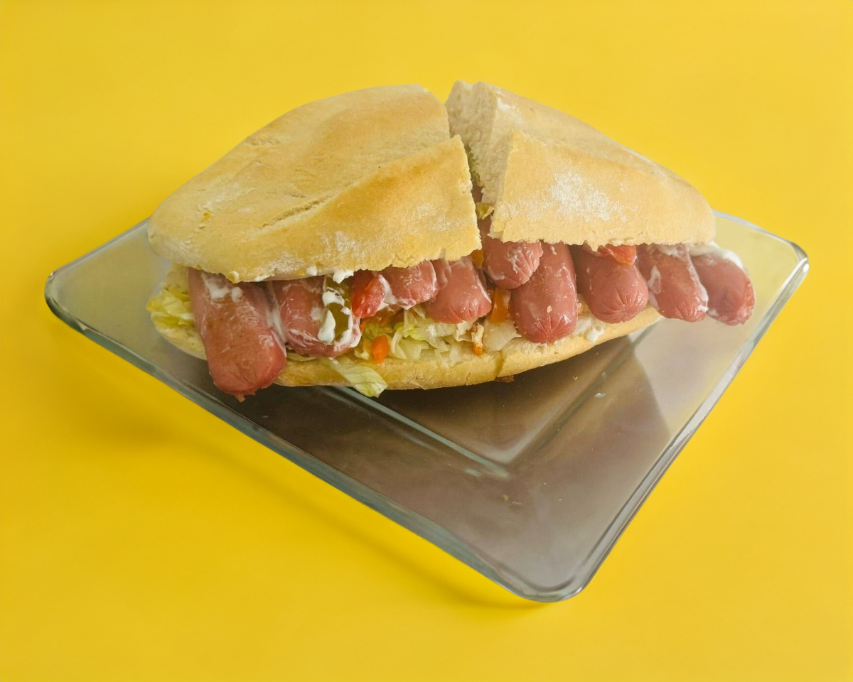 Salchicha 225 g, mostaza, lechuga, zanahoria en vinagre, chile jalapeños, jìtomate, cebolla, crema y aguacate.