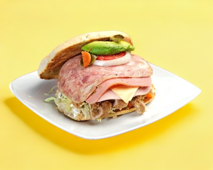 Milanesa, jamón, queso de puerco, queso amarillo, queso blanco y pastel de pollo.