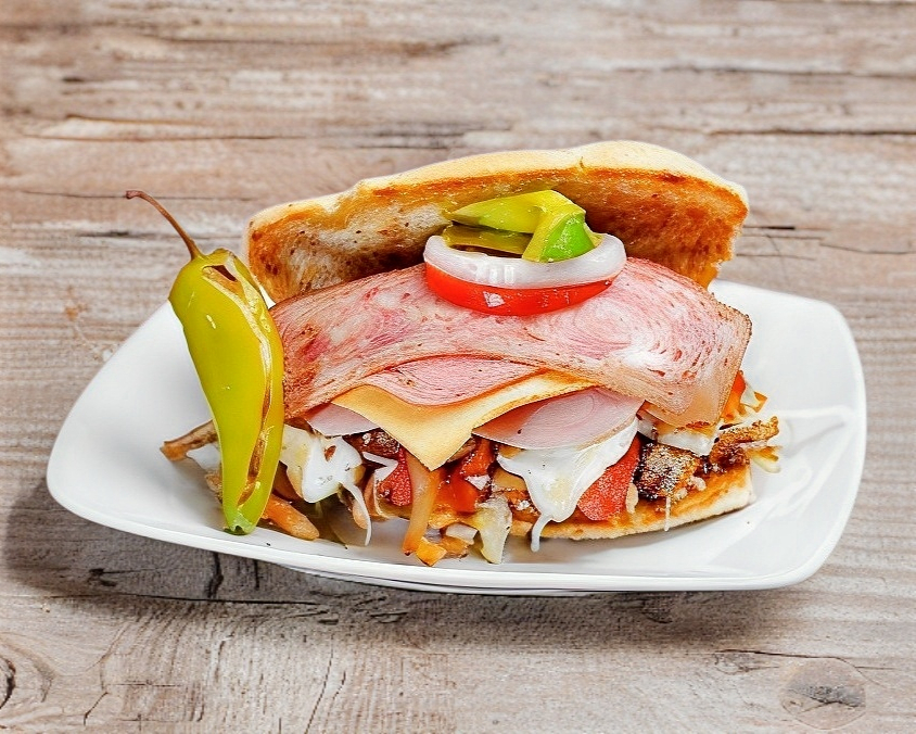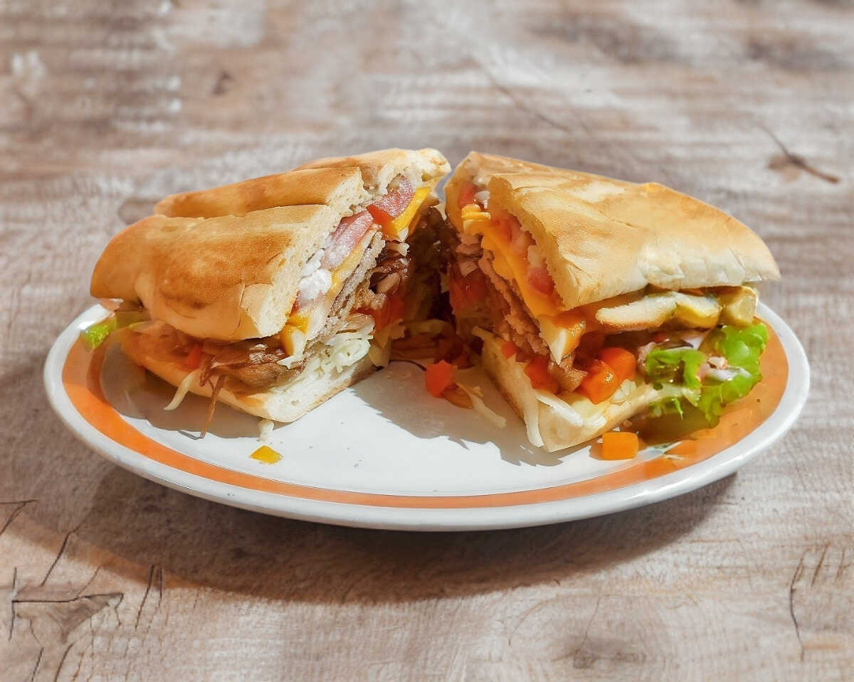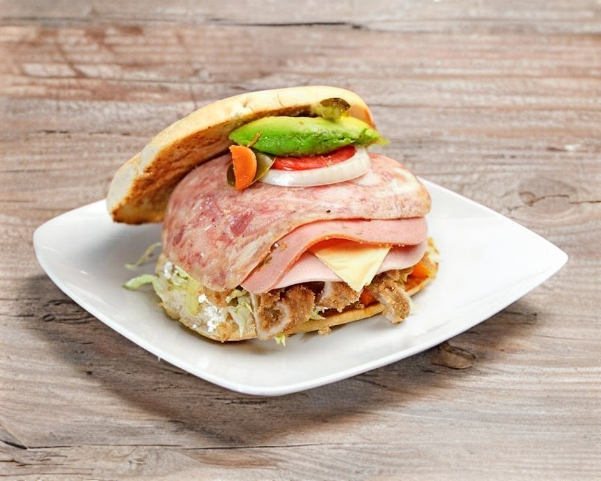 Milanesa, jamón, queso de puerco, queso amarillo, queso blanco y pastel de pollo.