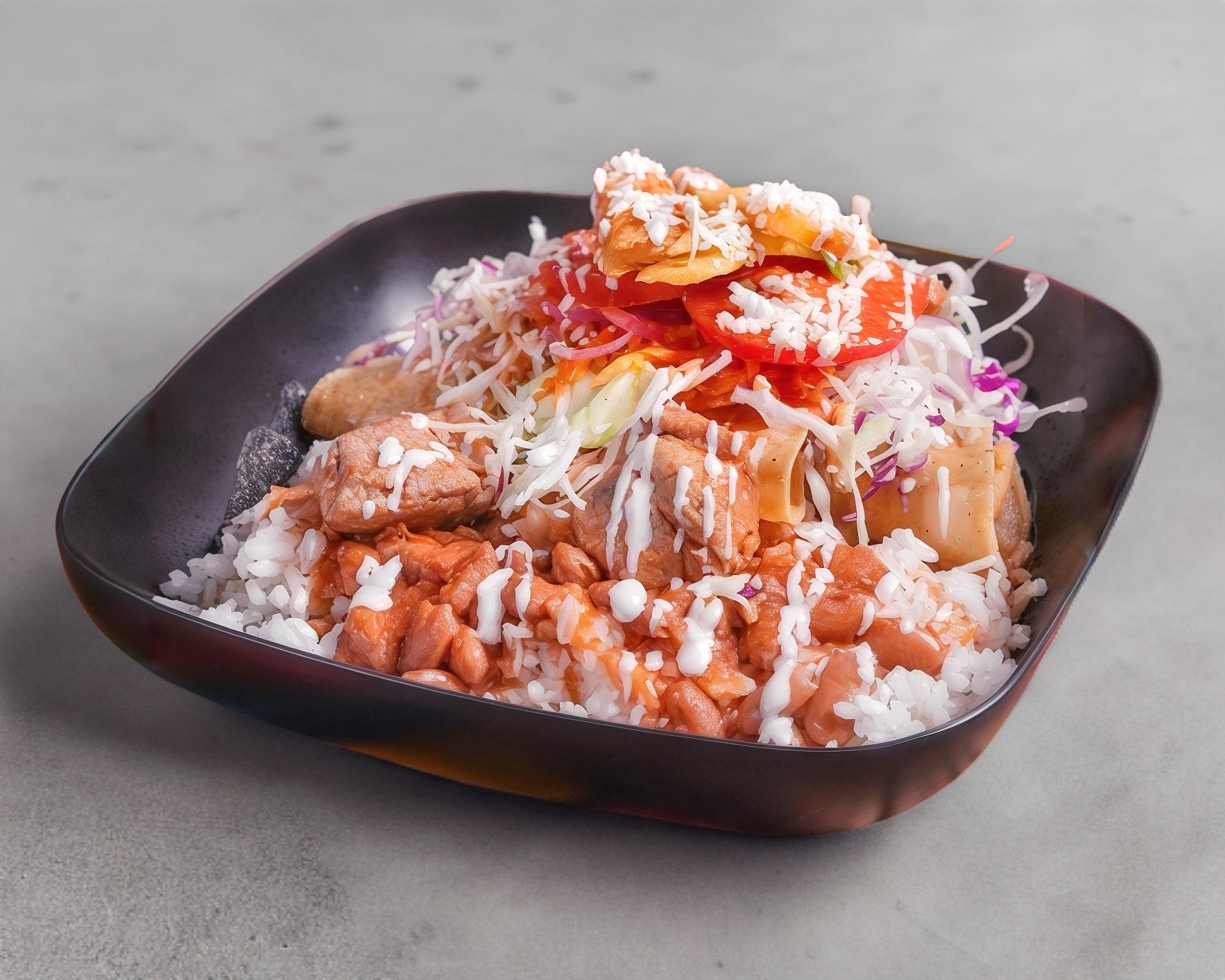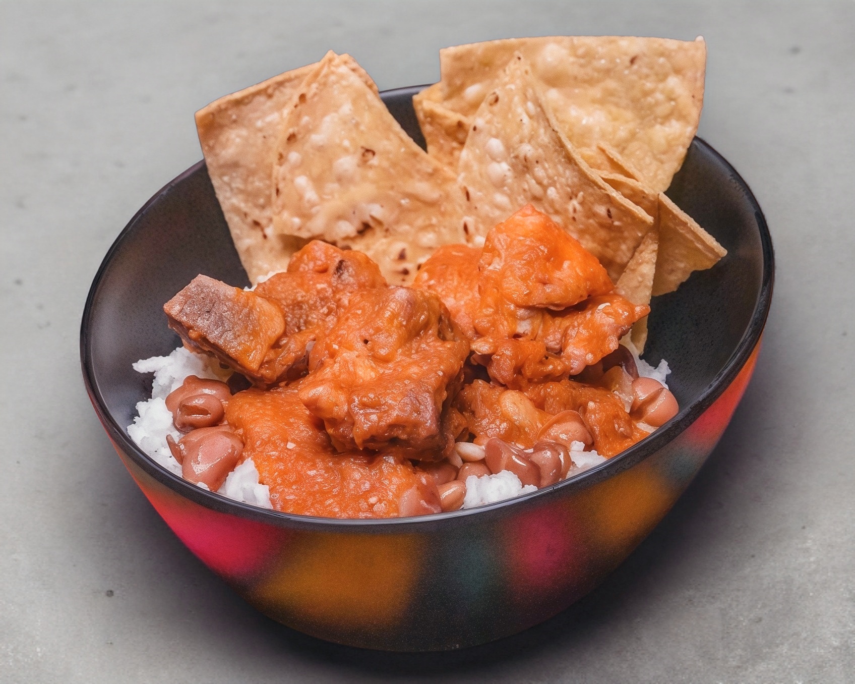 Arroz blanco con frijoles guisados, bañados en salsa roja, con carne de cerdo.