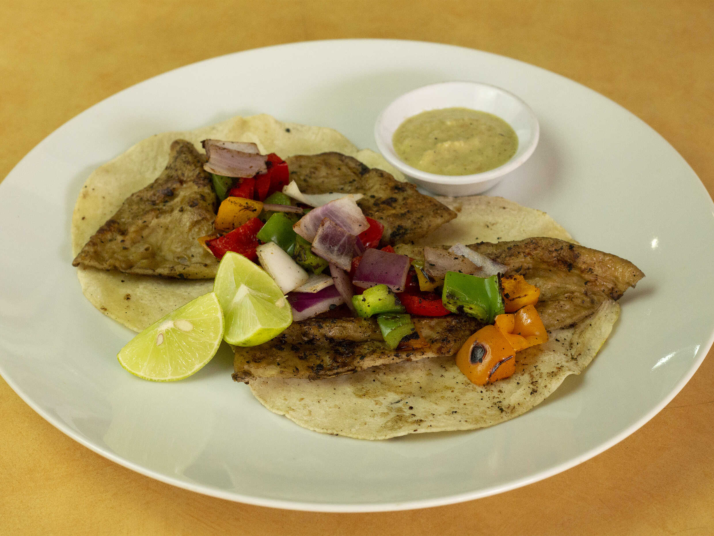 Orden de filete de seitán, acompañado de dos tortillas, pimiento morrón y cebolla asada.