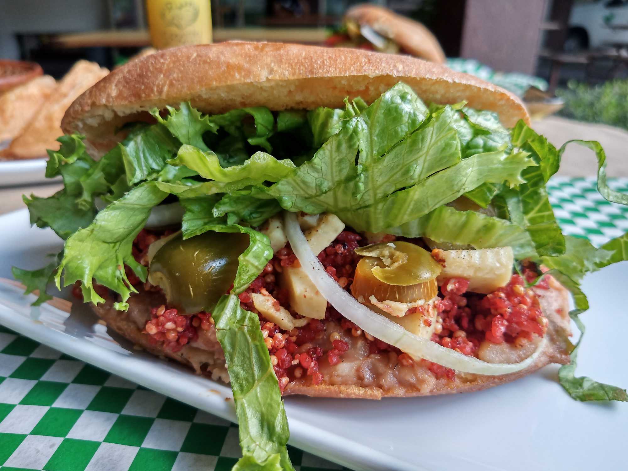 Torta vegana, de chorizo de quinoa rojo y queso tipo oaxaca, libre de lácteos.