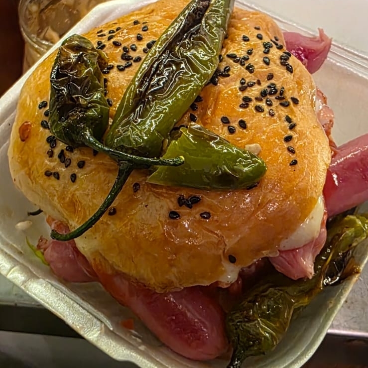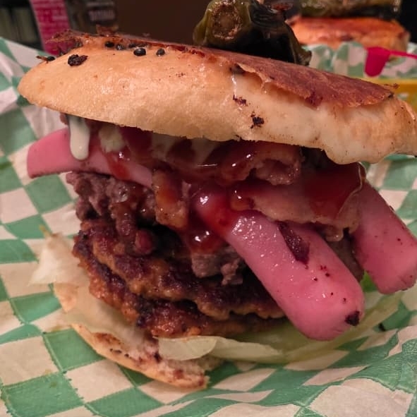 Doble carne, salchicha, queso amarillo, cebolla, jitomate, lechuga, catsup, mostaza, crema