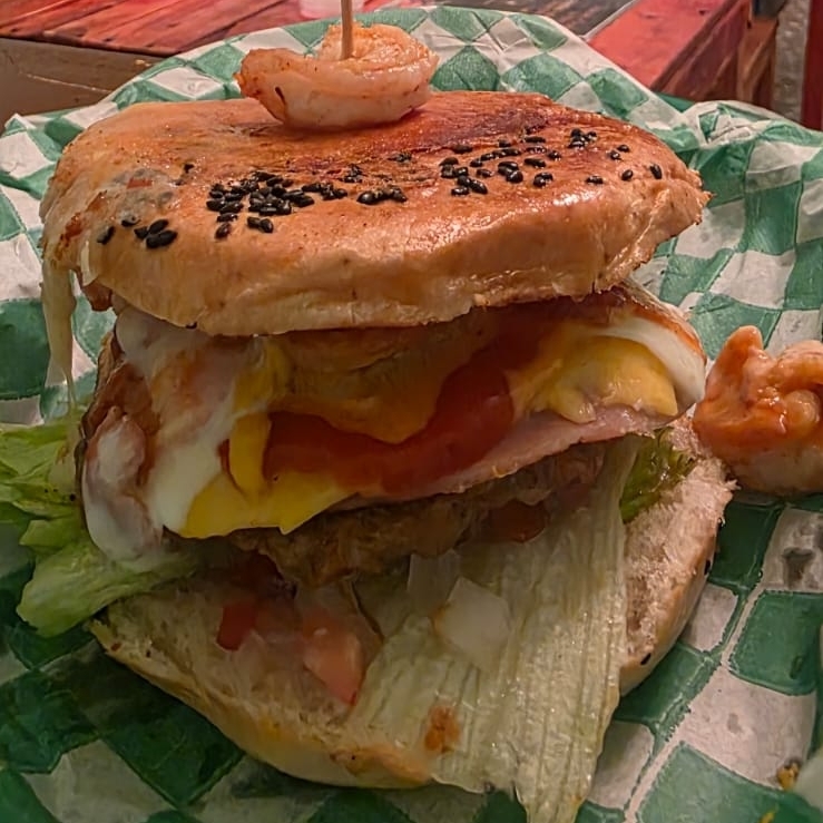 Carne, camarón, tocino, queso blanco, queso amarillo, costra de asadero, cebolla, jitomate, lechuga, catsup, mostaza, crema