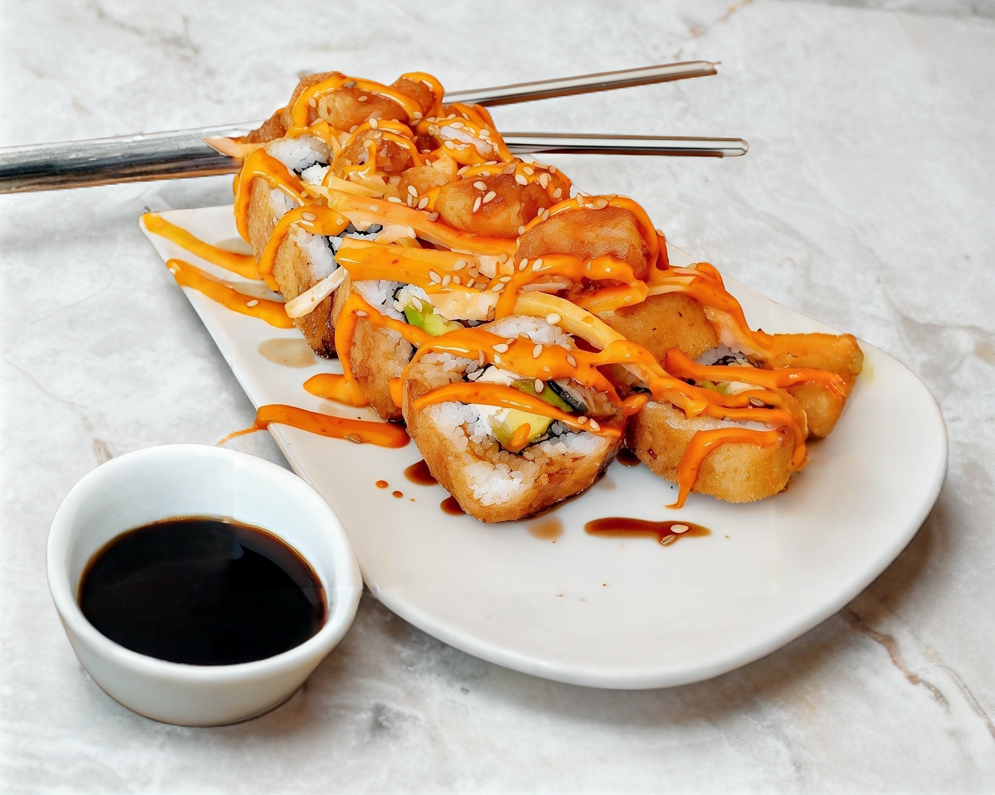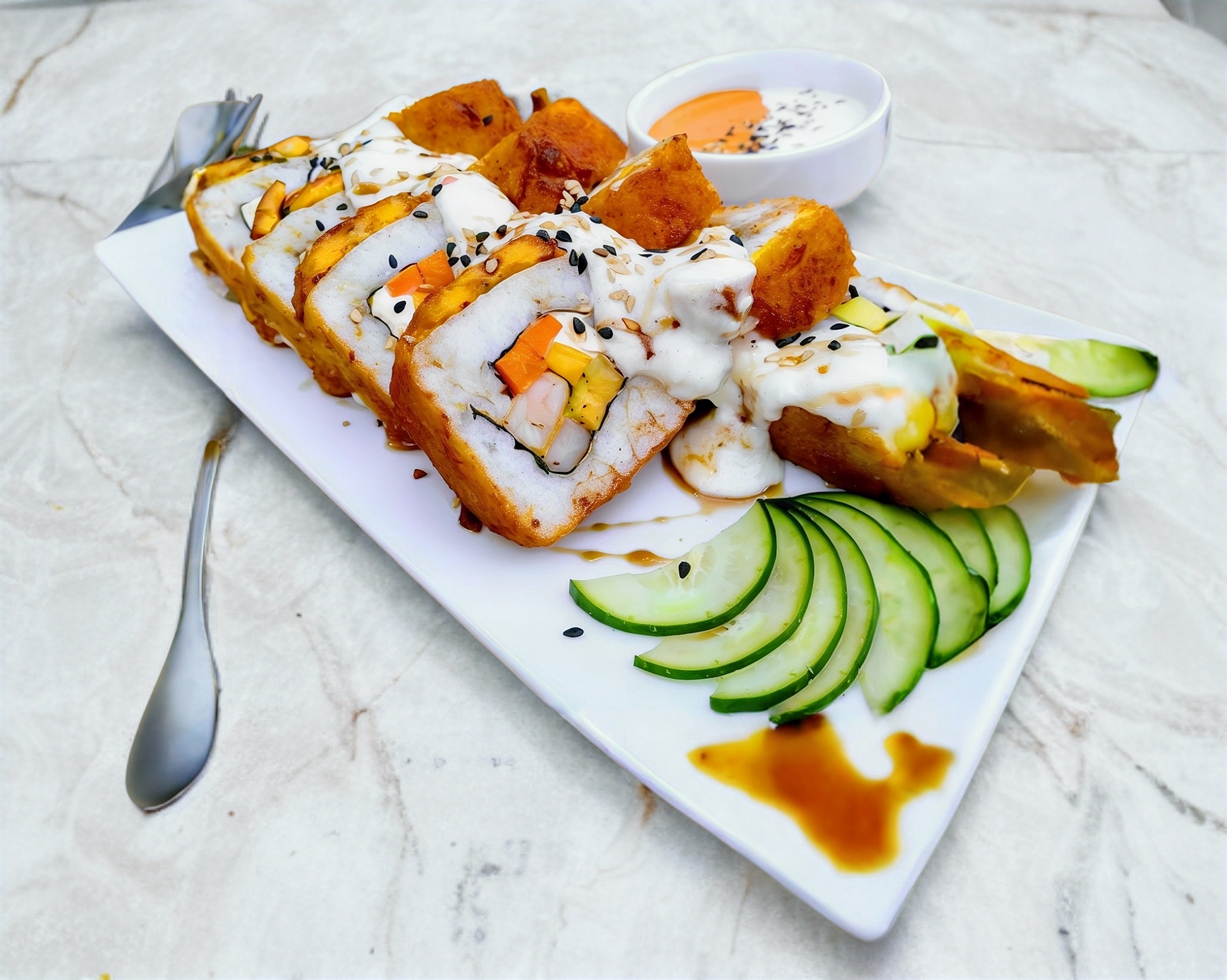 Queso crema, manchego y aguacate por dentro; ensalada tampico, camarones rocca aderezo spicy, salsa anguila y ajonjolí por fuera.