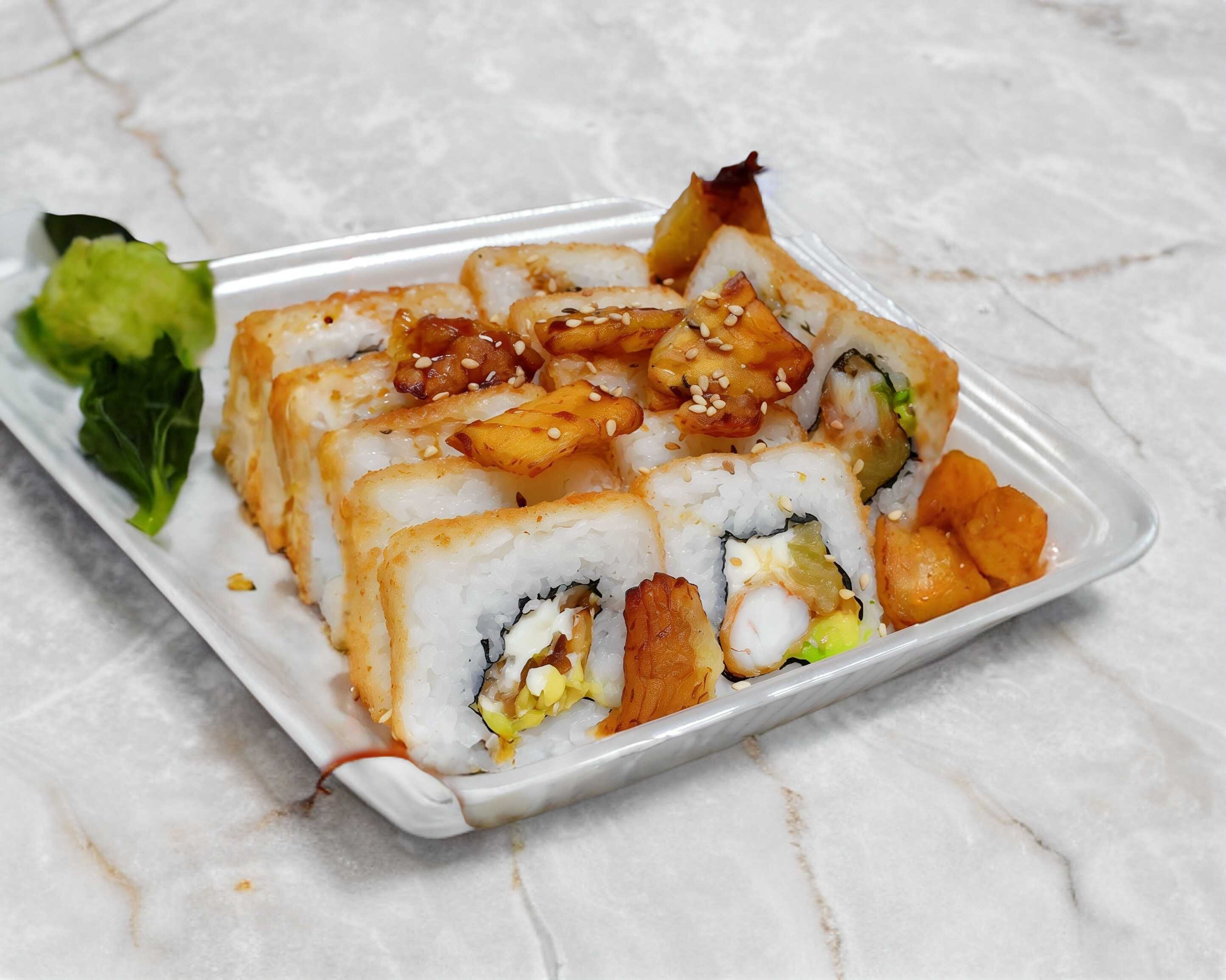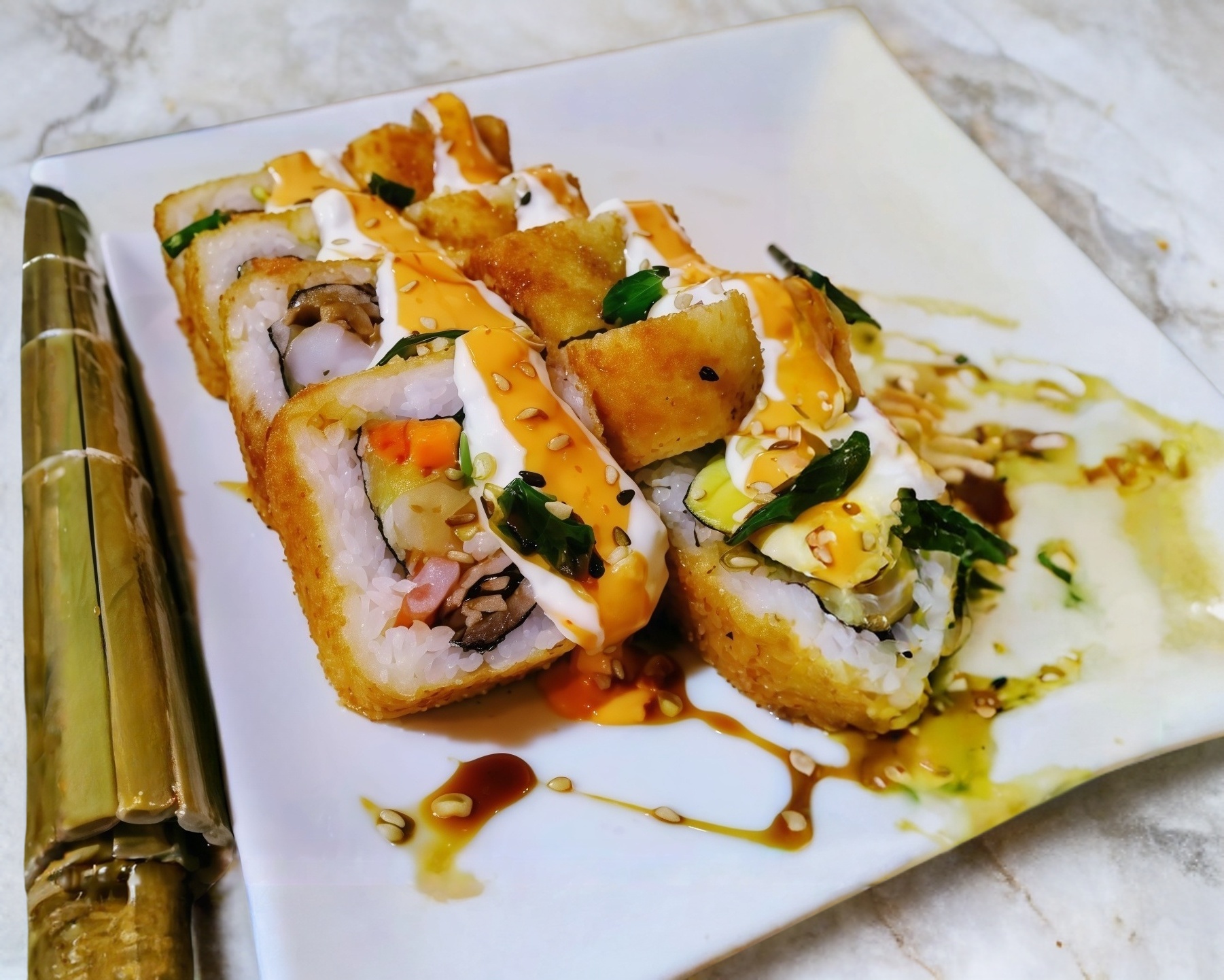 Camarones a la mantequilla, zanahoria, aguacate y queso crema por dentro; plátano macho, salsa anguila y ajonjolí por fuera. Incluye soya.