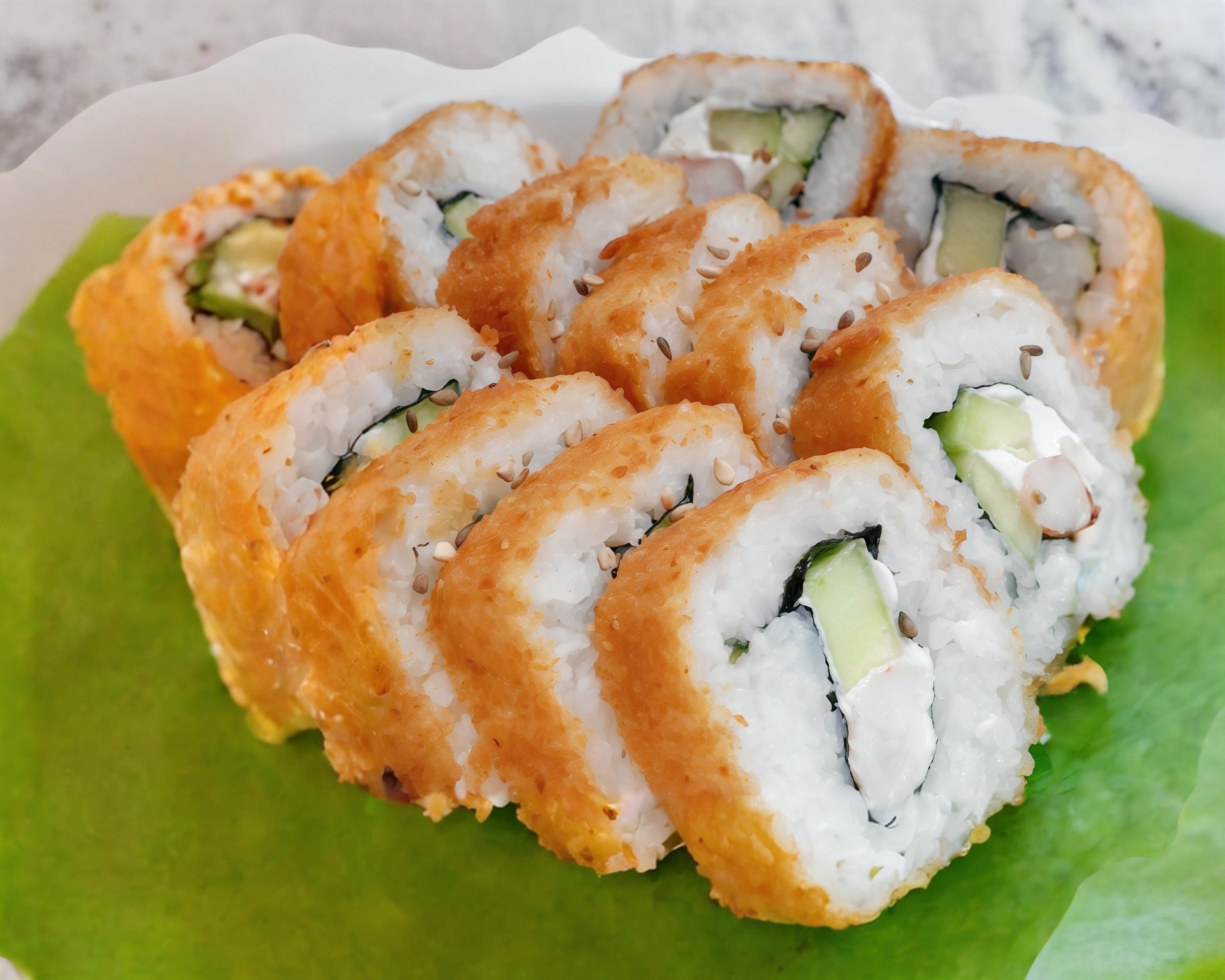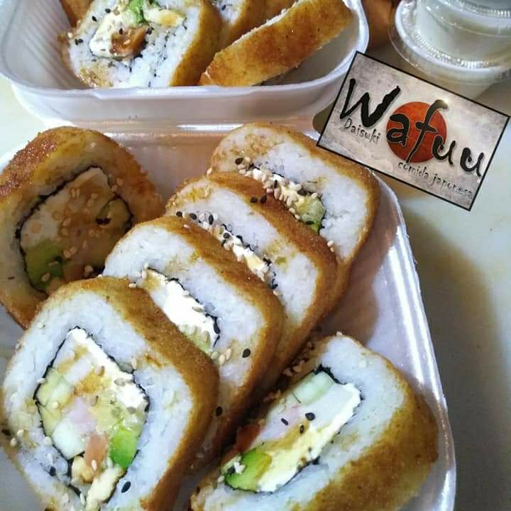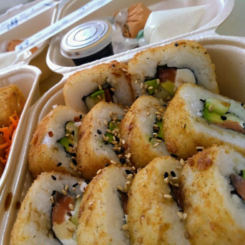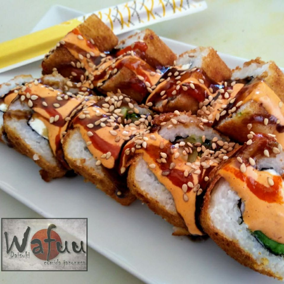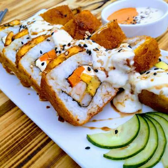 Camarones empanizados y aguacate por dentro; queso crema y ajonjolí por fuera. Incluye soya.