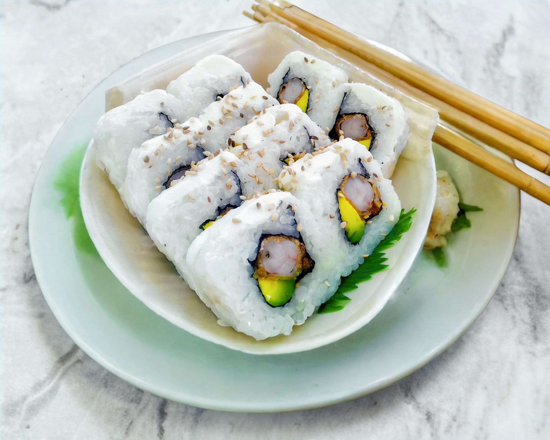 Camarón, pepino, queso crema, aguacate y ajonjolí; incluye soya.