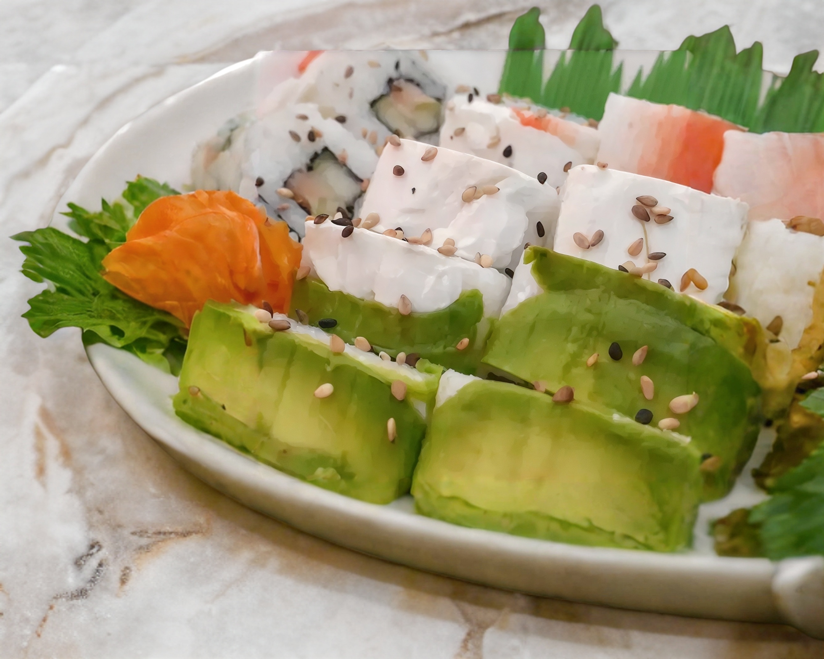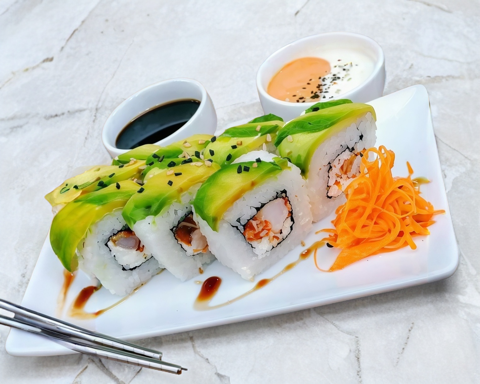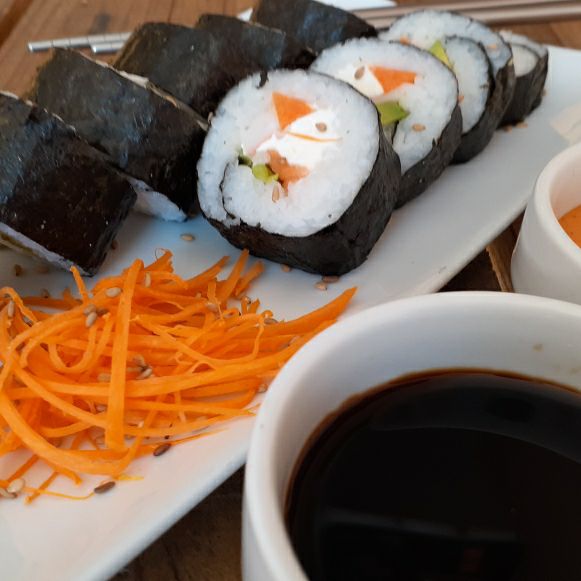 Zanahoria, queso crema, pepino y aguacate por dentro; alga y ajonjolí por fuera. Incluye soya.