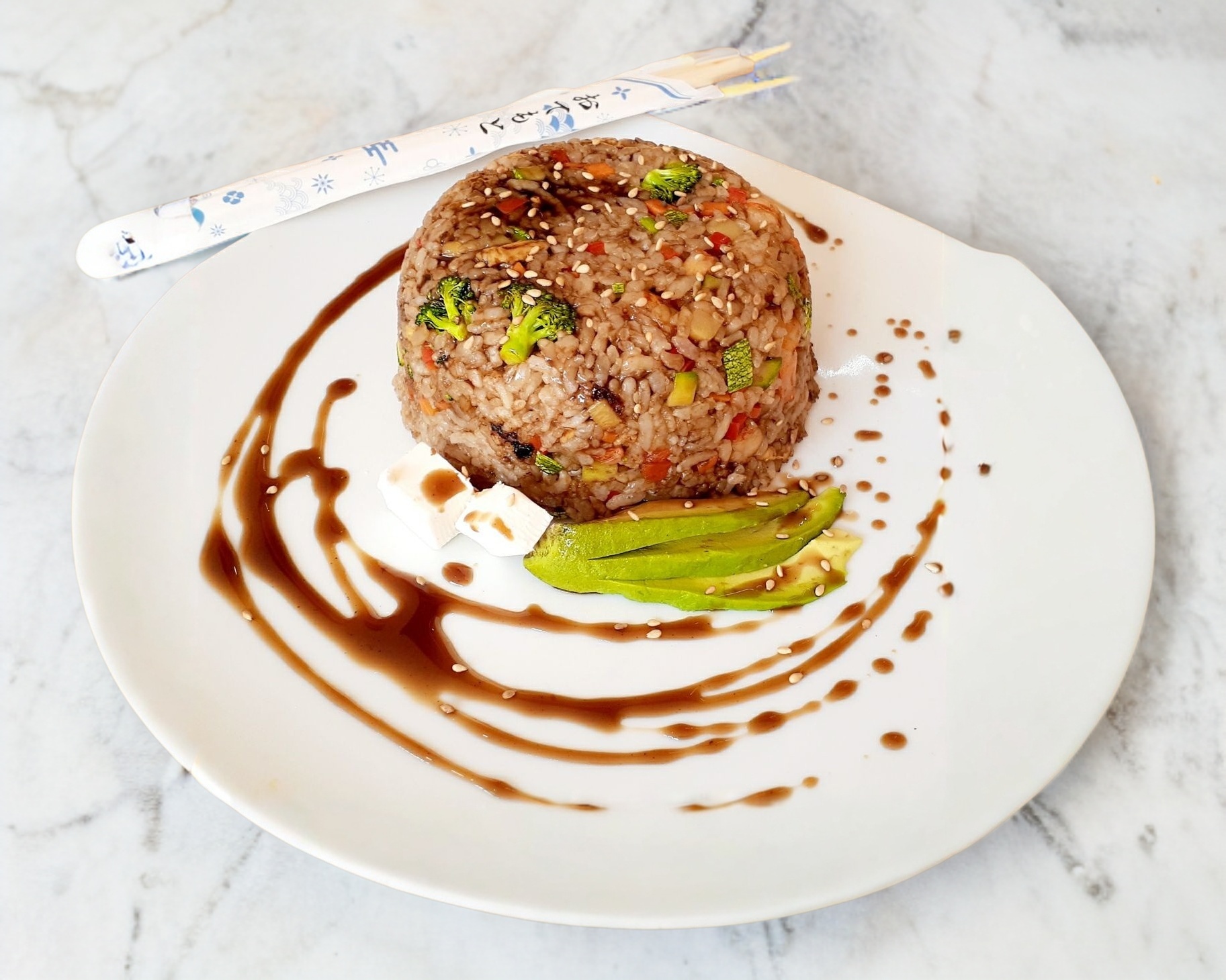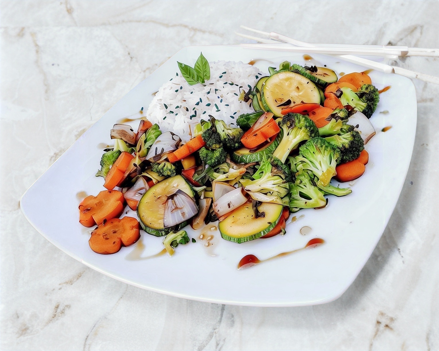 Verdura a la plancha con una guarnición de arroz y salsa teriyaki.