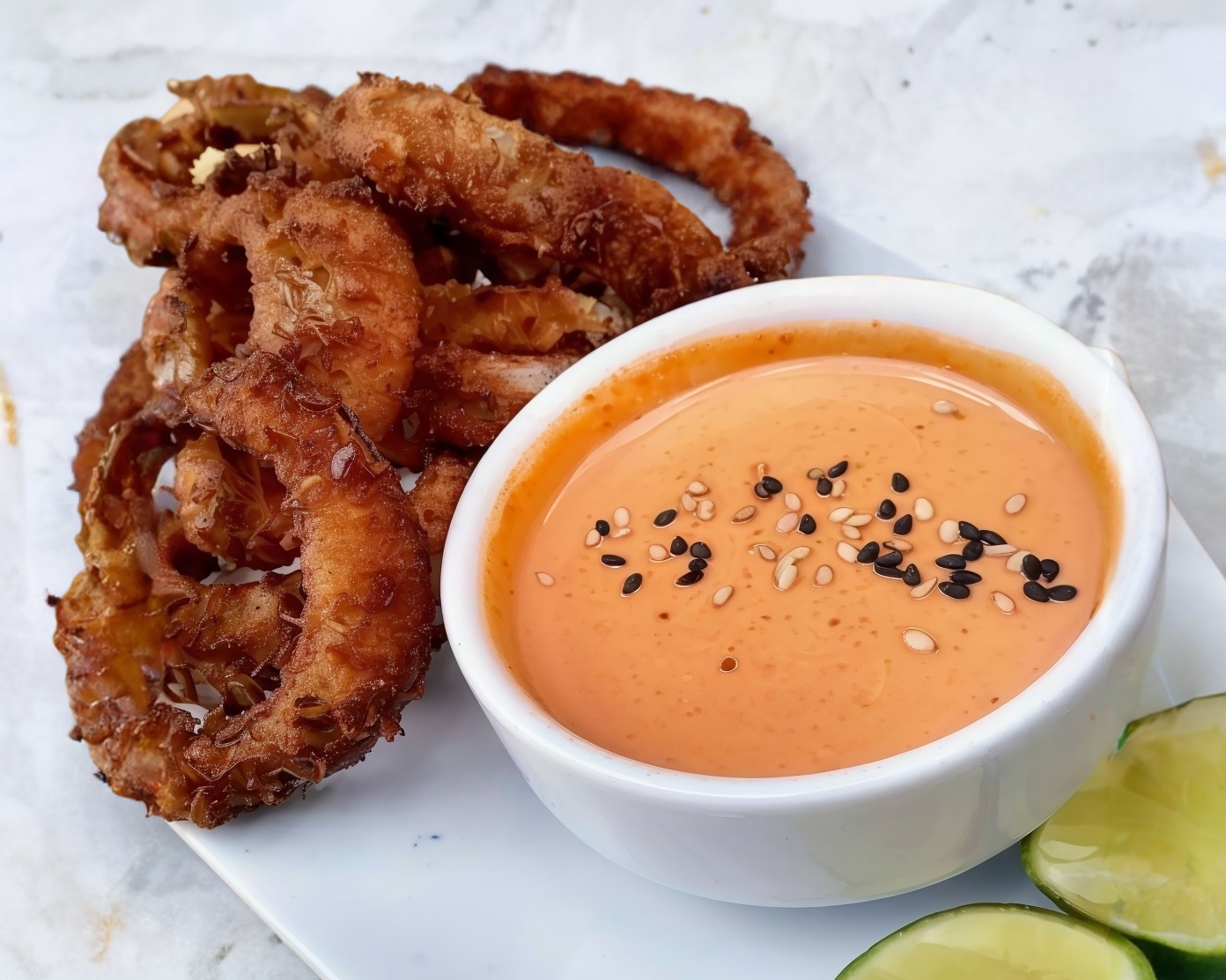 Crujientes aros de cebolla acompañados de aderezo spicy.