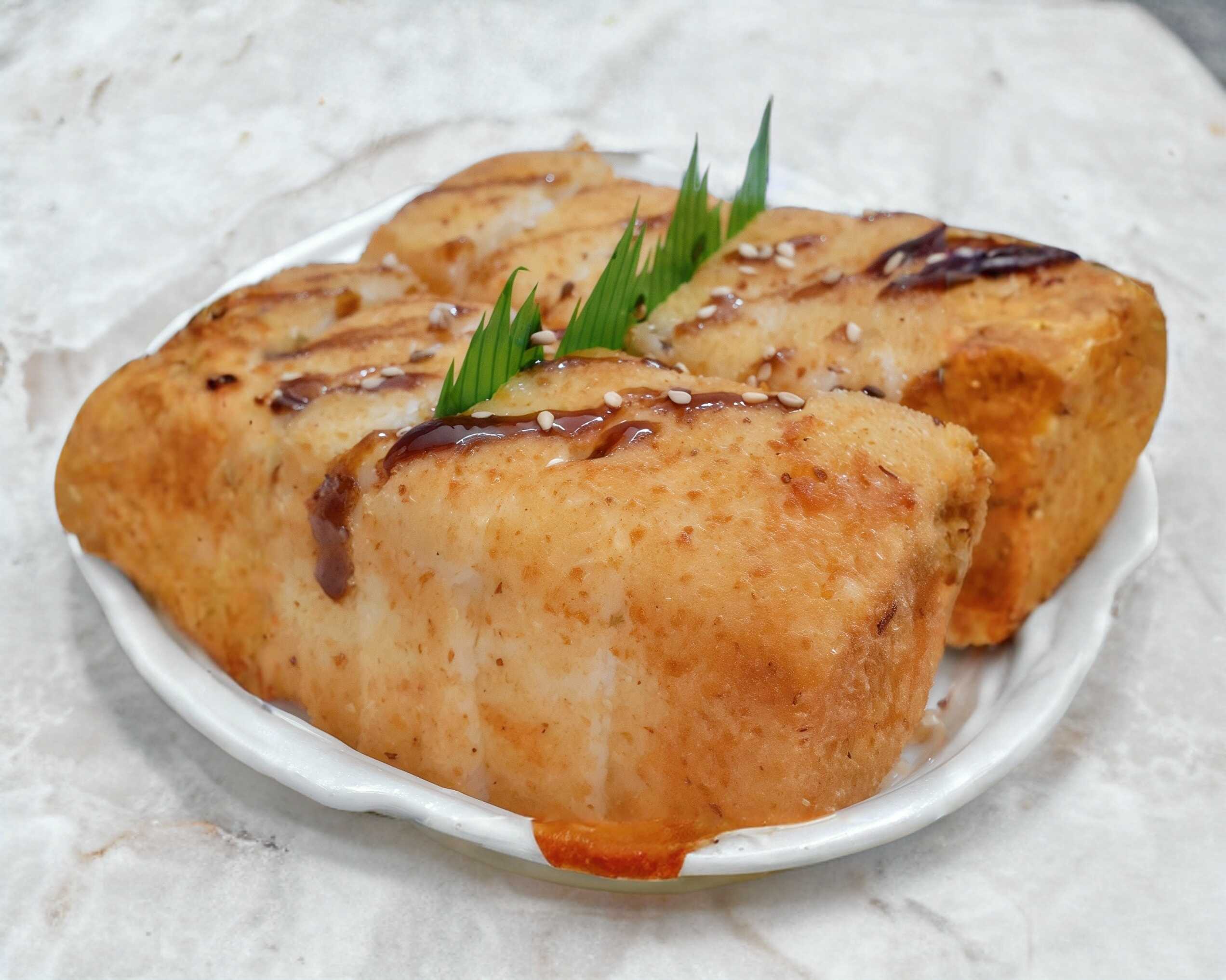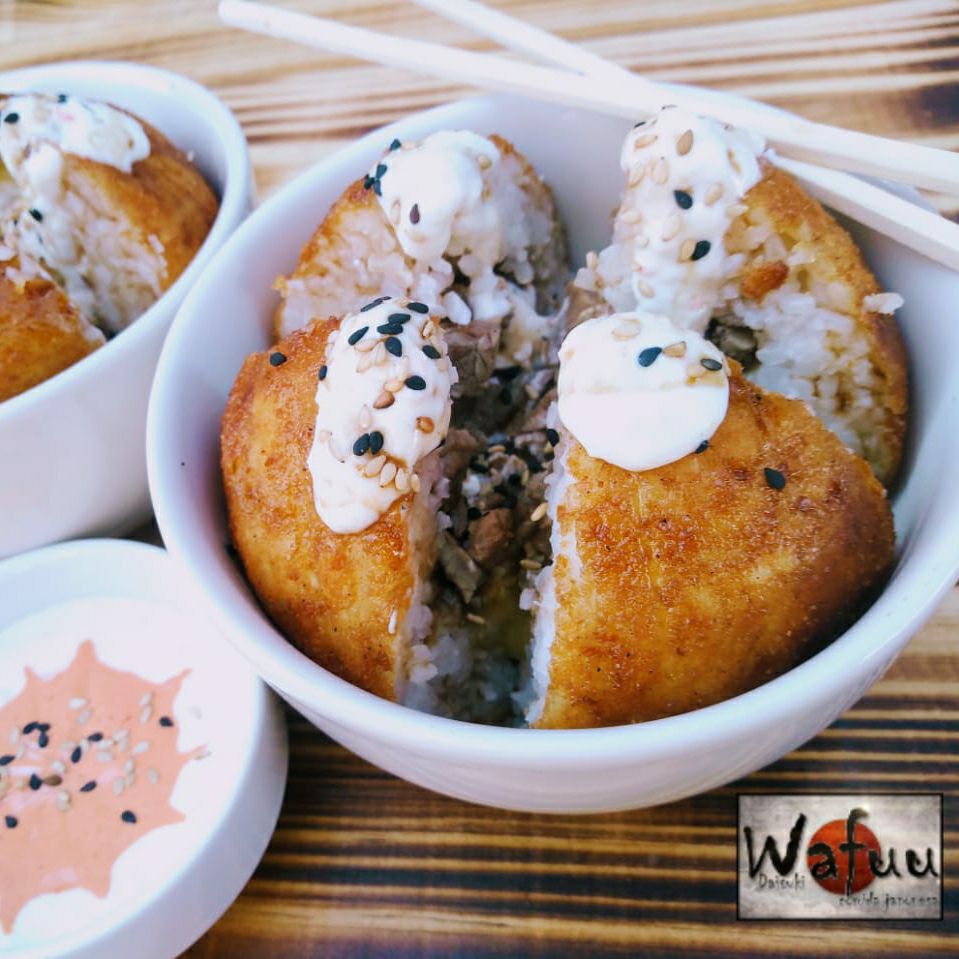 Bola grande de arroz empanizada rellena de quesos, proteina a elegir y ajonjolí; incluye soya.