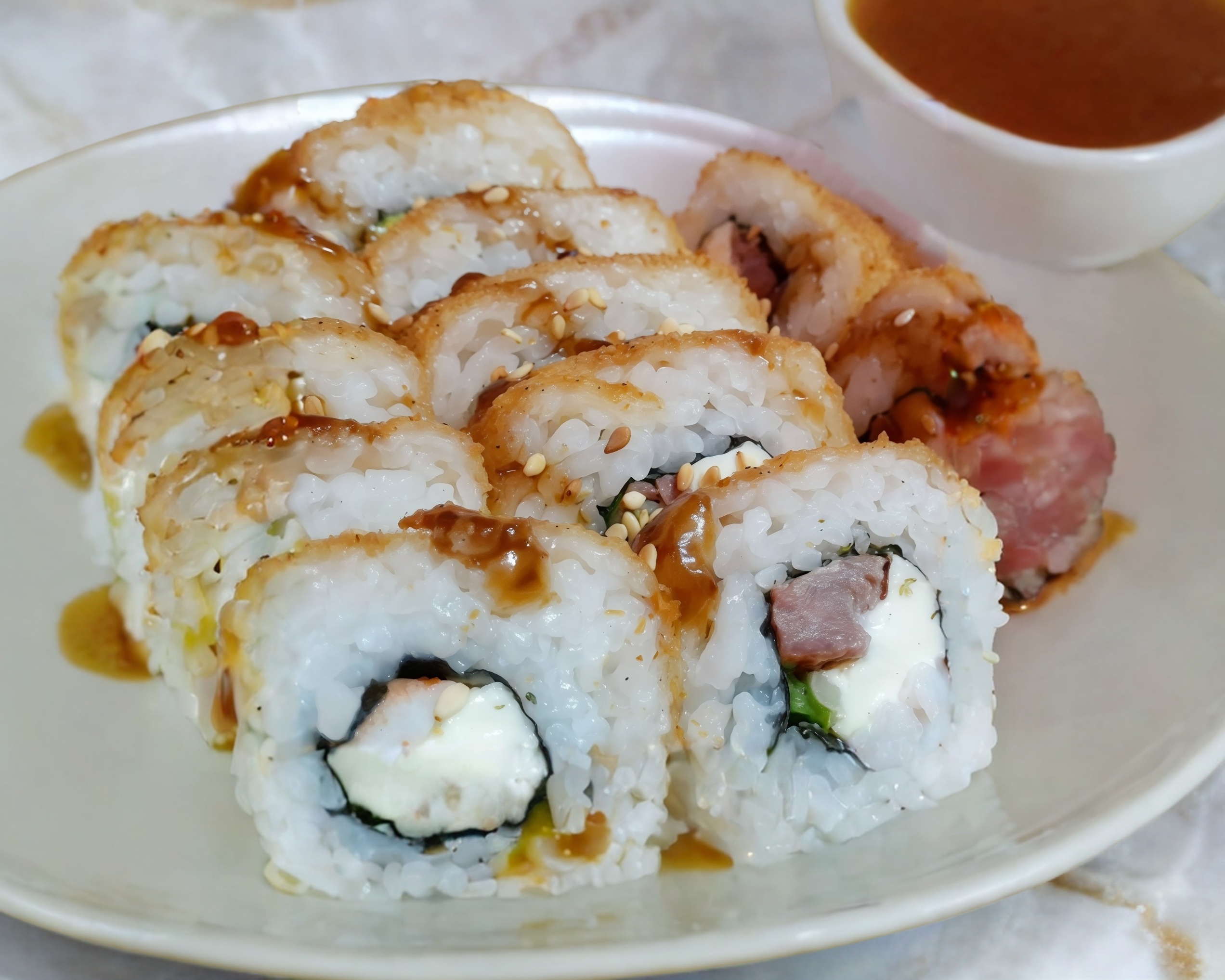 Camarón, res, queso crema, manchego, aguacate, salsa de anguila, ajonjolí. Incluye soya.