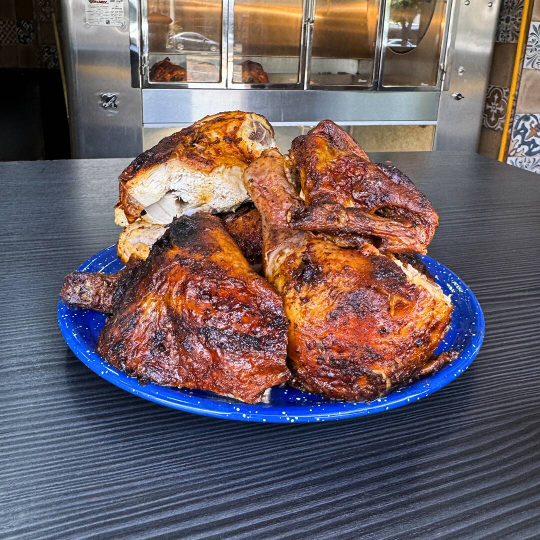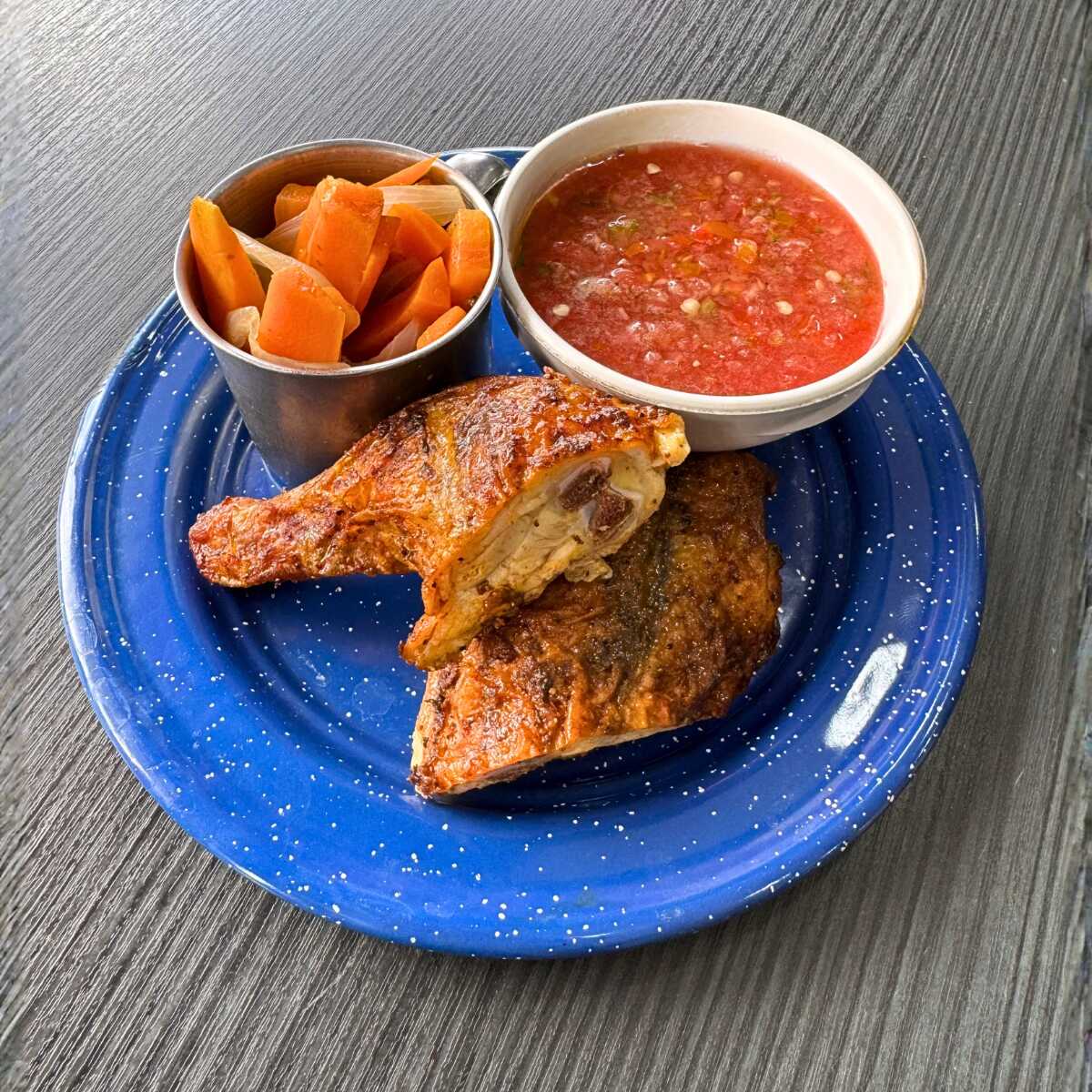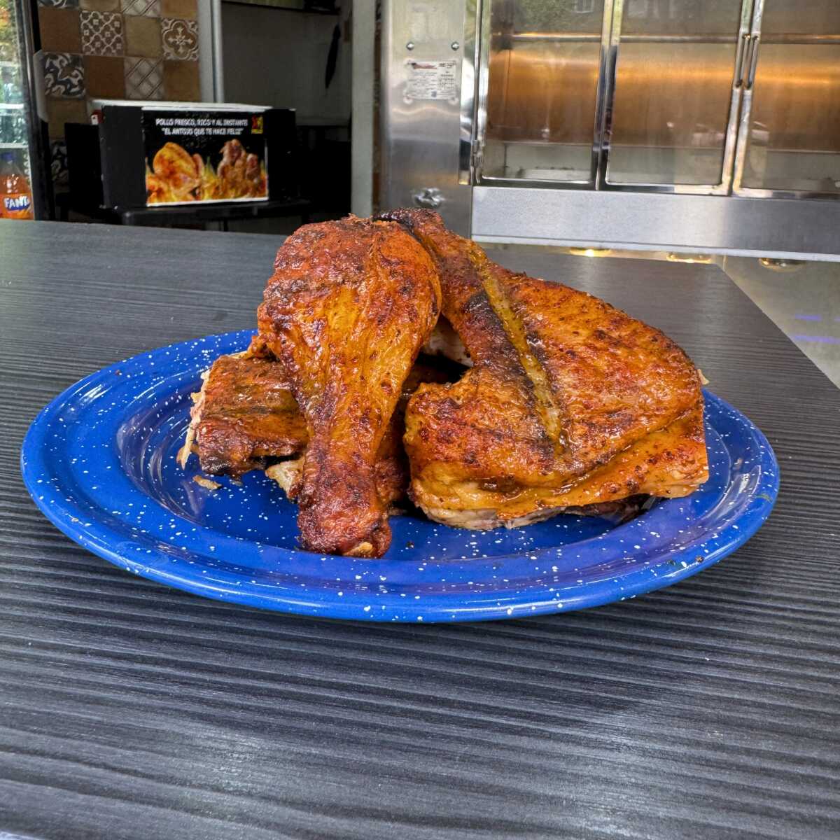 Delicioso pollo asado estilo ranchero, marinado con especias y asado lentamente para lograr un sabor jugoso y una piel dorada irresistible. Acompañado de salsa, tortillas hechas a mano, zanahorias en curtido y papas cambray, perfecto para disfrutar un auténtico pollo asado casero.
