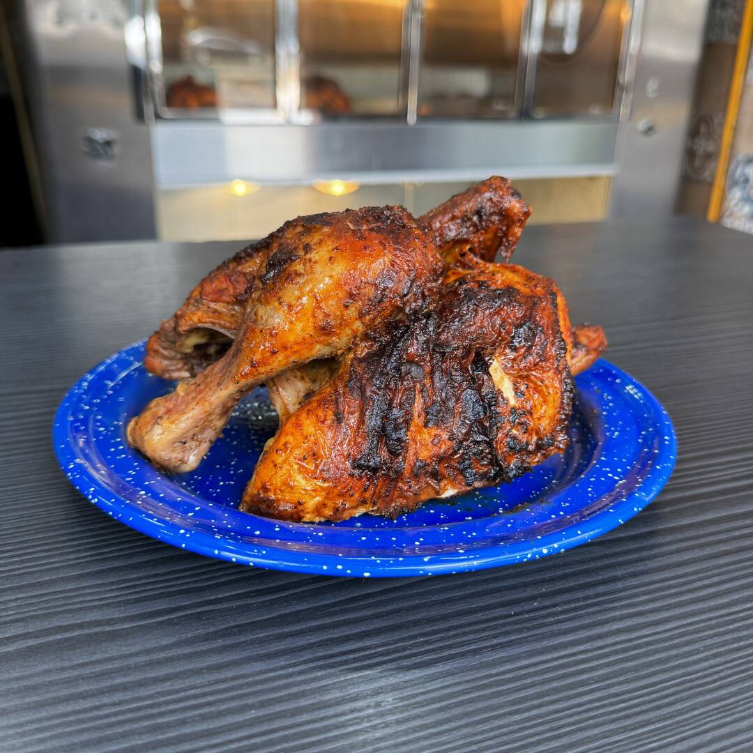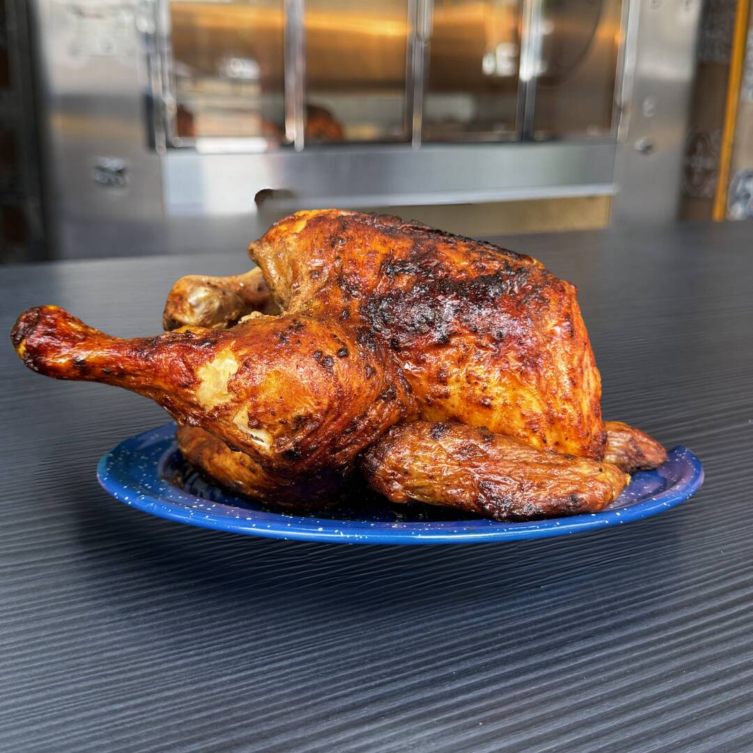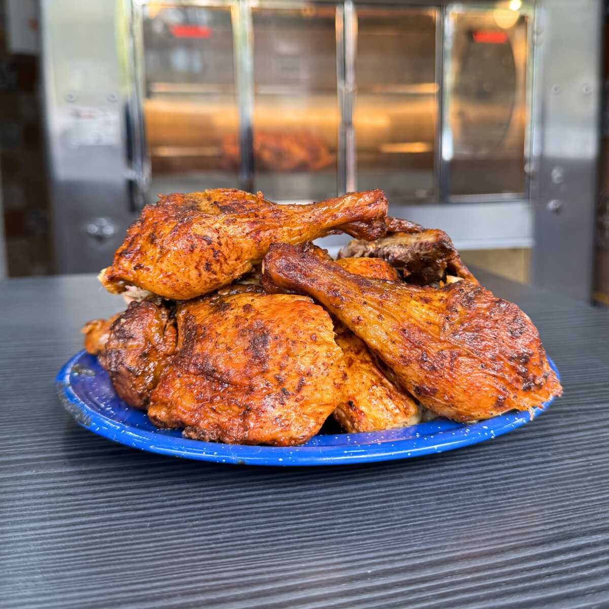 Delicioso pollo rostizado entero, marinado con una mezcla especial de especias y cocinado lentamente hasta lograr una piel dorada y carne jugosa por dentro. Se acompaña con salsa casera, tortillas hechas a mano, papas cambray adobadas y zanahorias en curtido, creando el combo perfecto para disfrutar en familia.