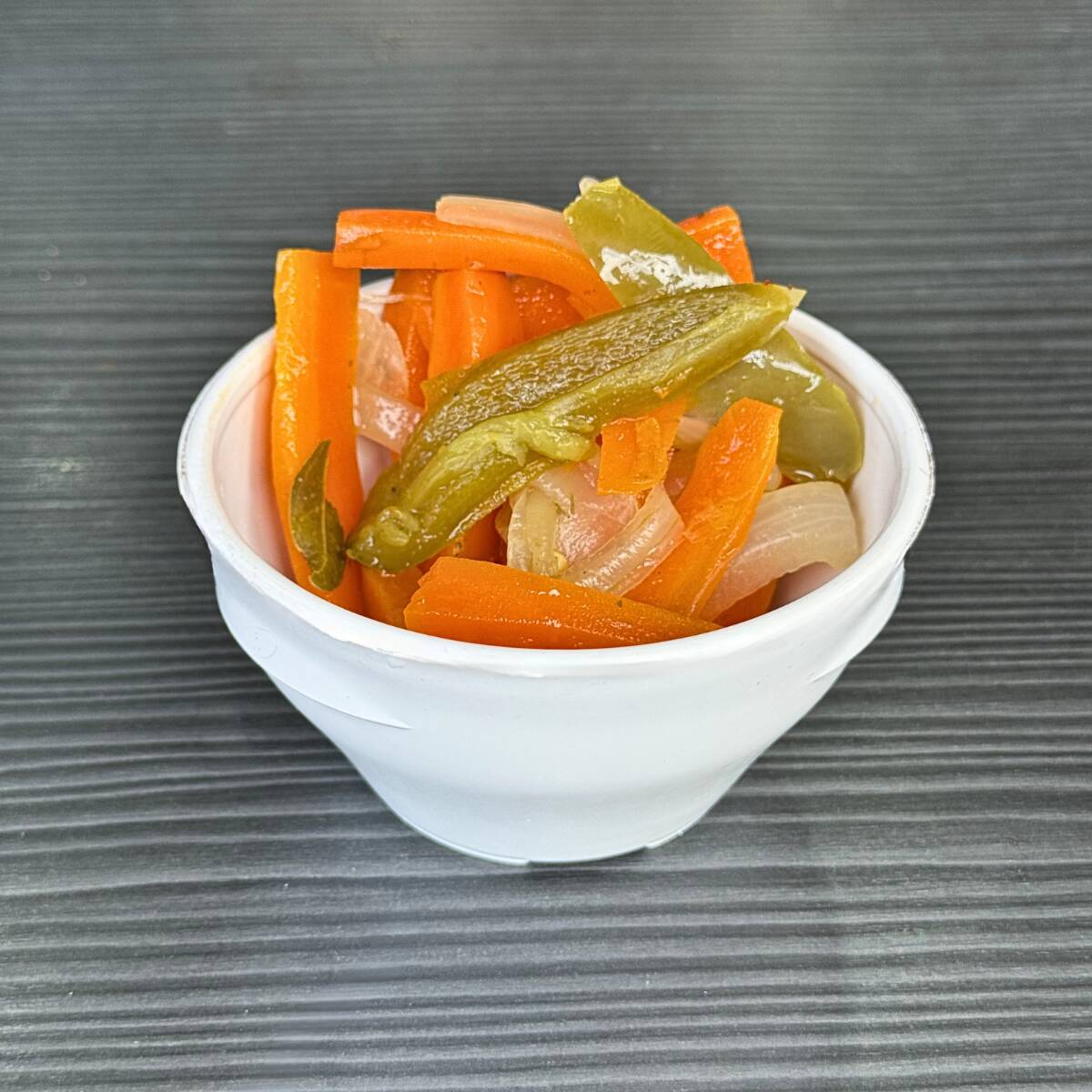 Crujientes zanahorias en curtido con chile y cebolla, preparadas al estilo casero con un toque ligeramente ácido y picosito que resalta el sabor del pollo rostizado o pollo asado. El complemento perfecto para darle frescura y un toque tradicional a cada bocado.