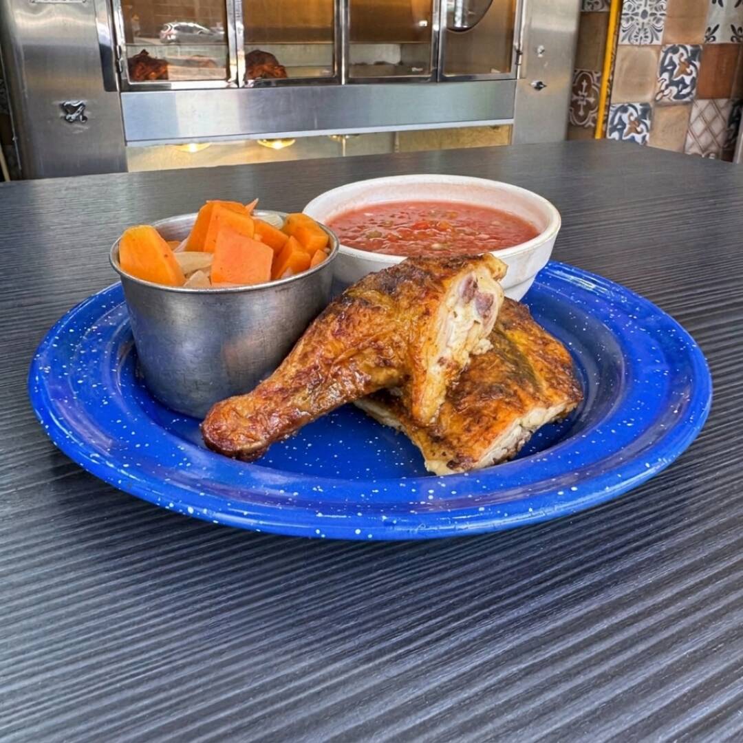 Delicioso pollo rostizado, marinado con una mezcla especial de especias y cocinado lentamente hasta lograr una piel dorada y carne jugosa por dentro. Se acompaña con salsa casera, tortillas hechas a mano, papas cambray adobadas y zanahorias en curtido, creando el combo perfecto para disfrutar en familia.