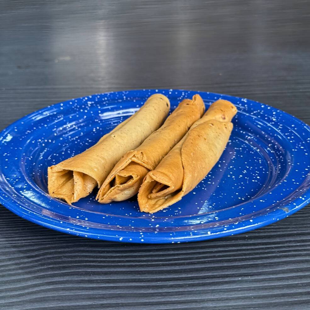 Tres tacos dorados crujientes rellenos de pollo, fritos al momento para lograr un dorado perfecto.