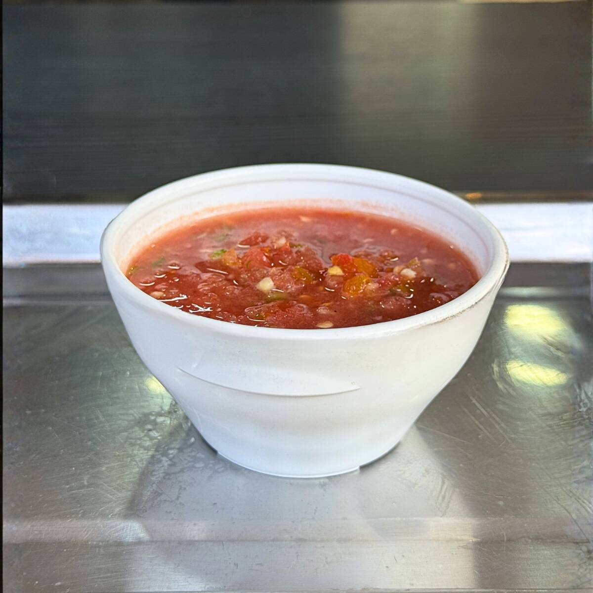 Una salsa fresca y picosita preparada al momento con jitomate, chile, cebolla y cilantro, finamente picados para conservar todo su sabor natural. Su textura cruda y su toque picante equilibrado la hacen el complemento perfecto para acompañar el pollo rostizado, tacos o totopos. Una salsa casera que resalta cada bocado con un sabor auténtico y lleno de carácter.