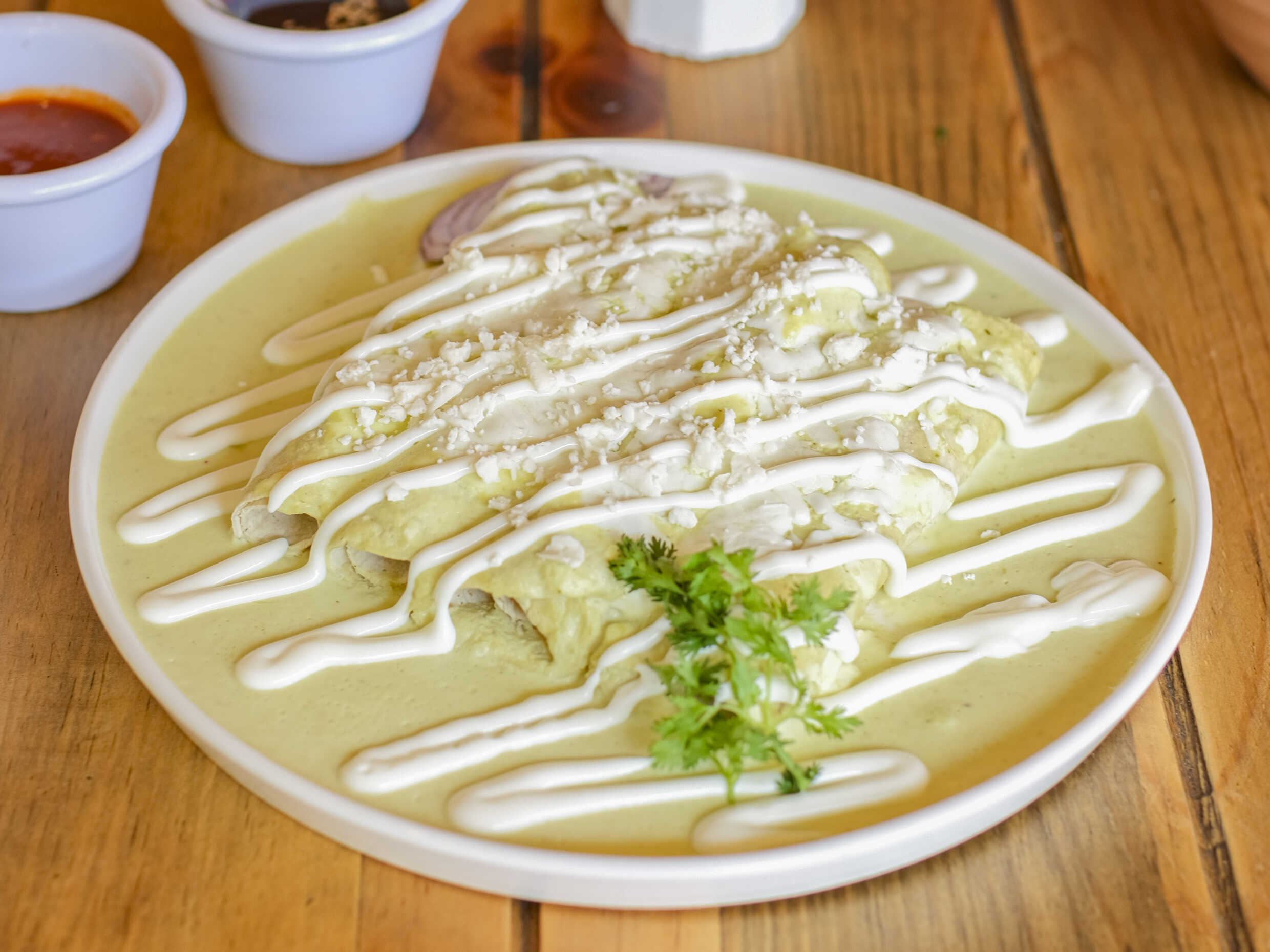 Tortillas suaves bañadas en salsa de frijol y rellenas de pollo deshebrado.