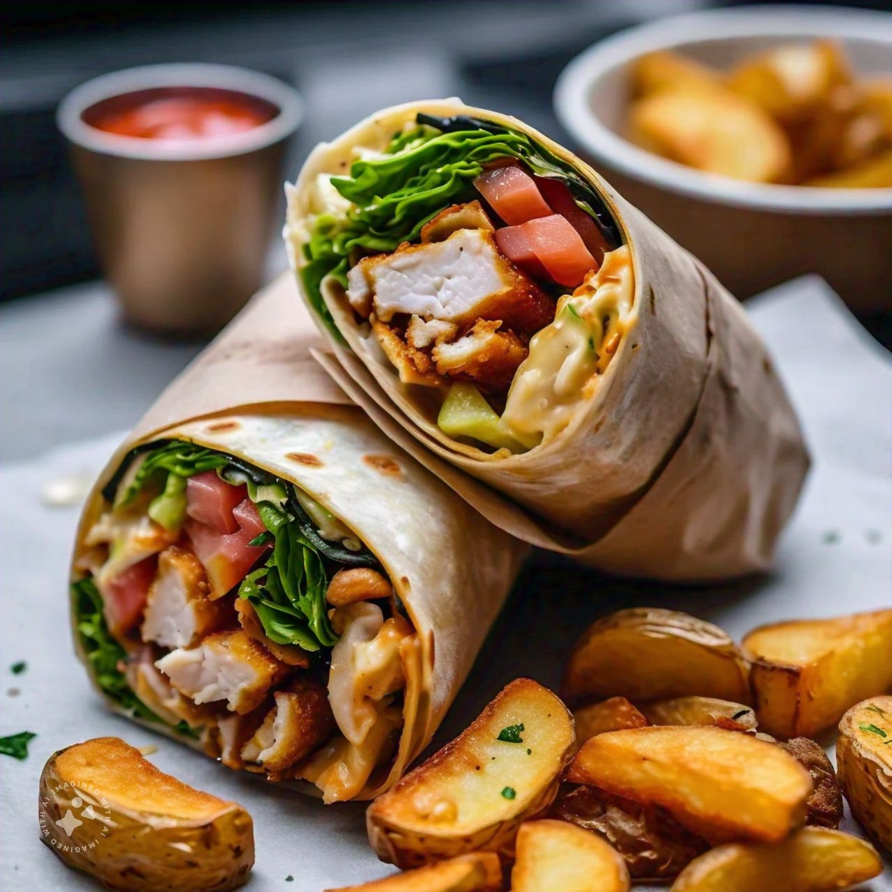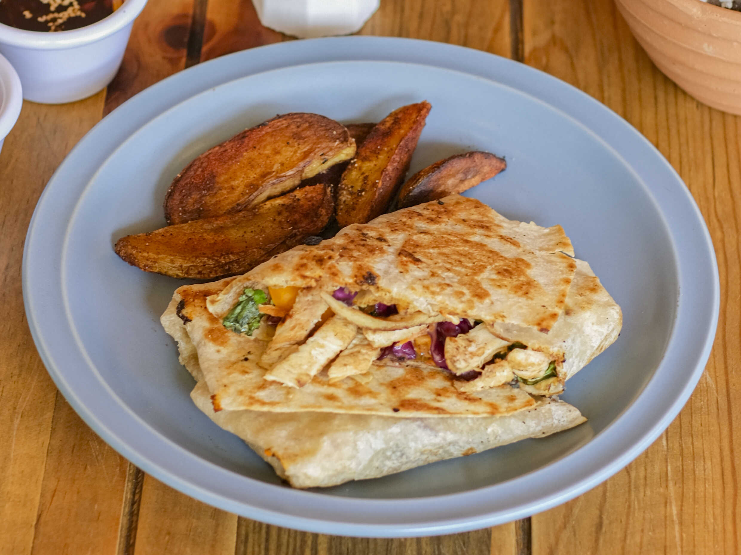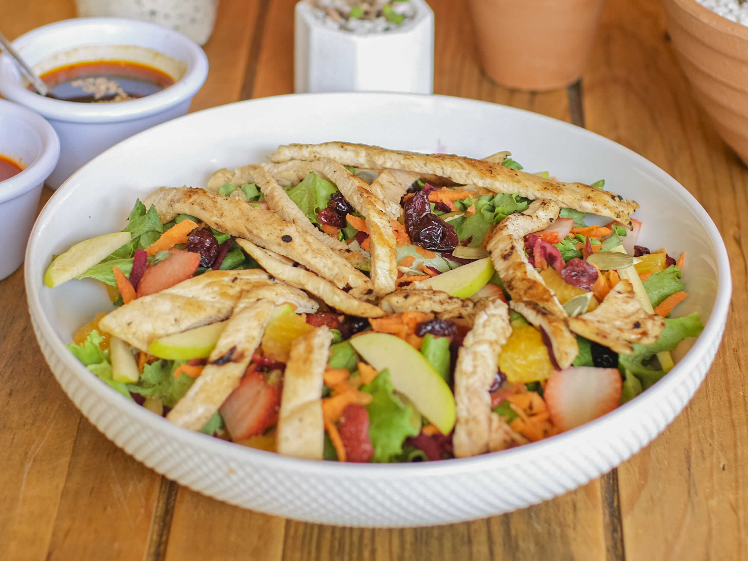 Fajitas de pollo, lechuga, pimientos, pepino, aderezo ranch, col morada, zanahoria y queso gratinado. Acompañado de papas gajo.