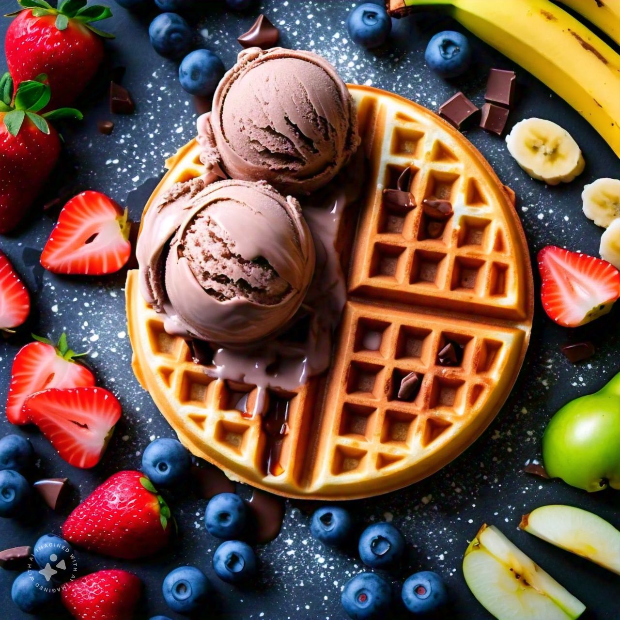 Waffle Relleno de chispas de chocolate, fruta, helado de chocolate y salsa de cacao.