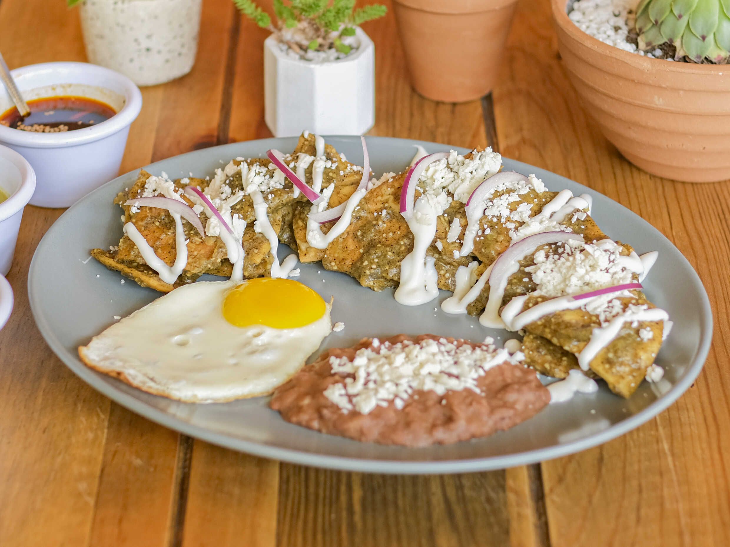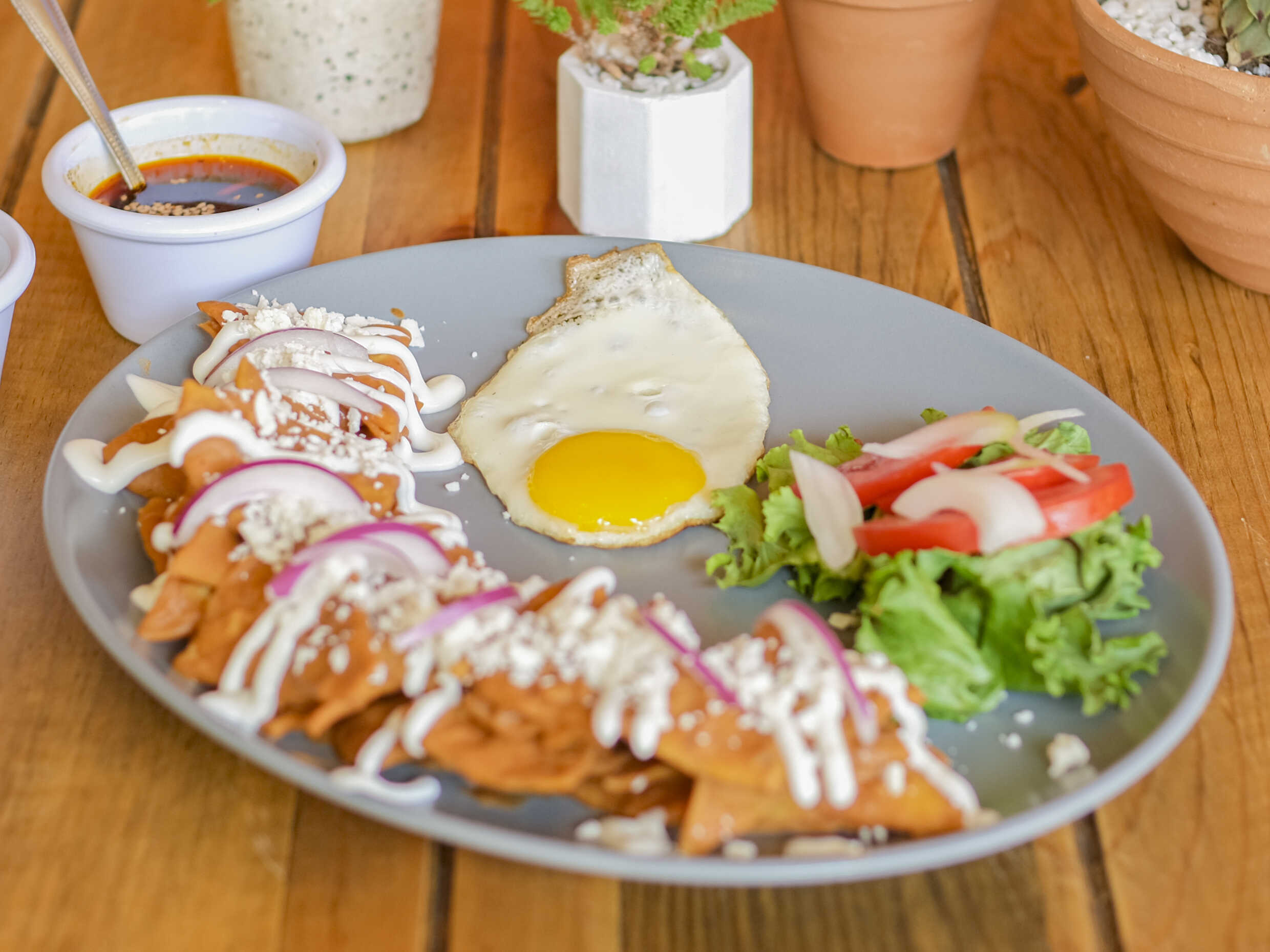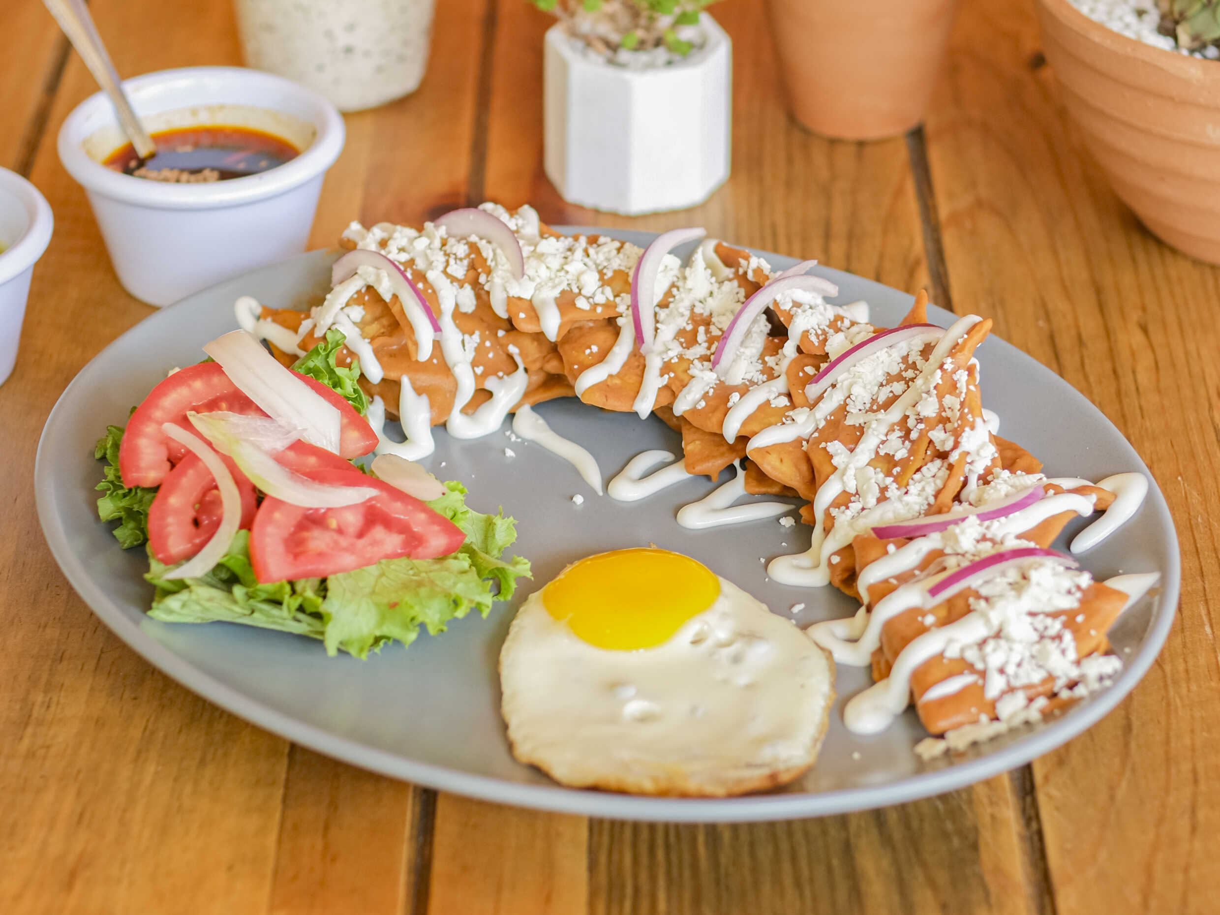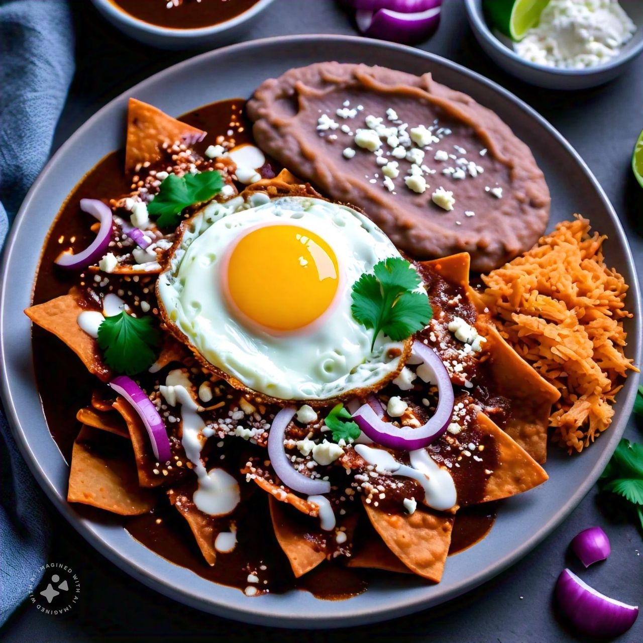 Totopos crujientes en mole, con queso ranchero, crema, cebolla morada, frijoles refritos, arroz rojo, y huevo. Un platillo lleno de sabor y tradición..