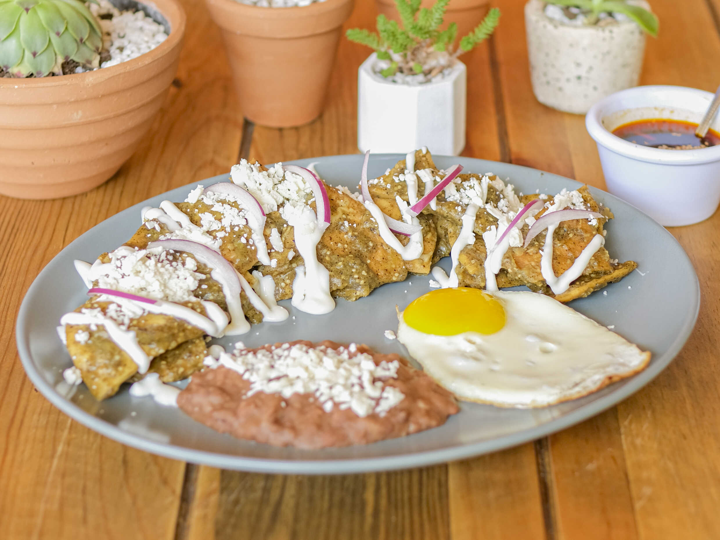 Chilaquiles verdes crujientes con huevo, frijoles refritos, queso ranchero, crema y cebolla fresca. Sabor Autentico Mexicano.