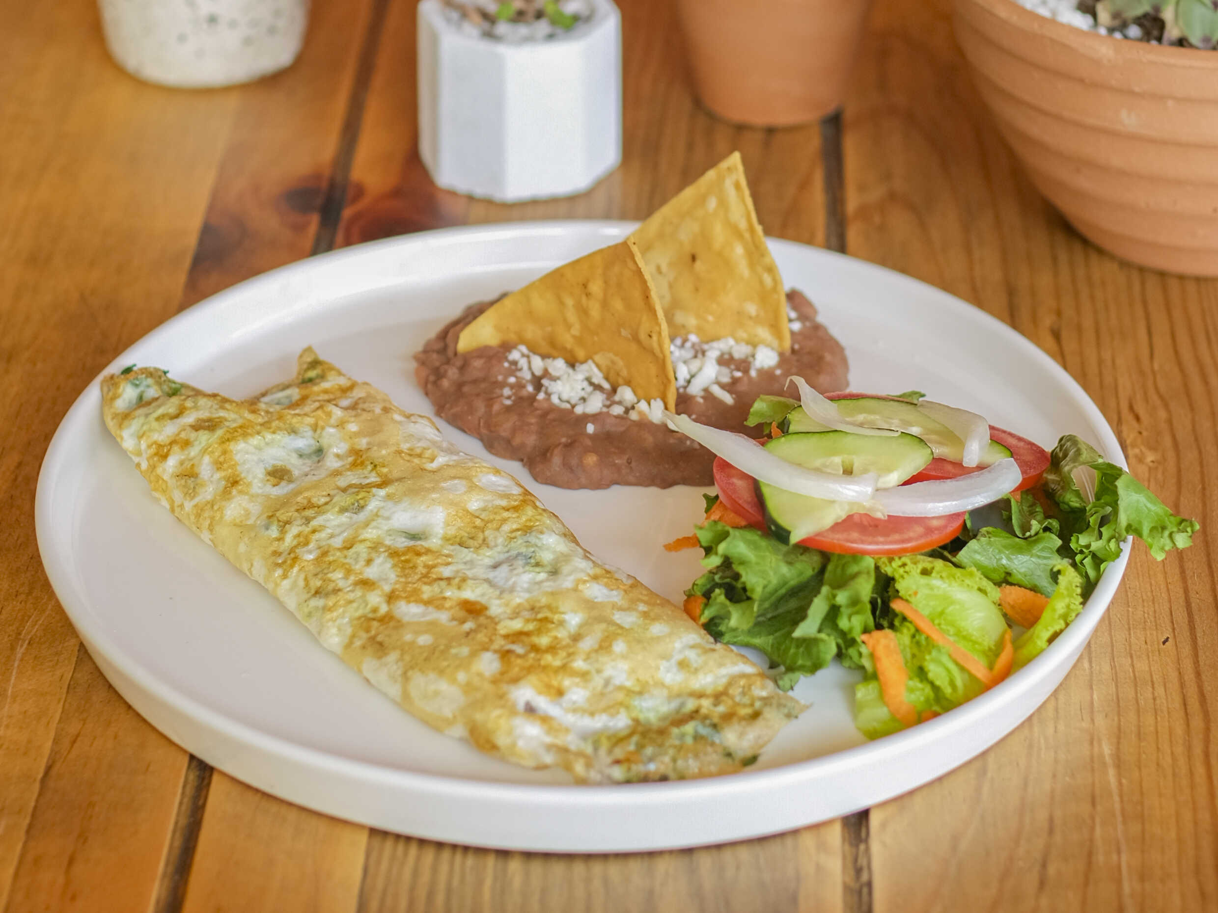 Huevos rancheros en salsa roja o verde, cubiertos con cebolla morada, crema y queso ranchero, acompañados de frijoles refritos. Un Clásico lleno de sabor y tradición.