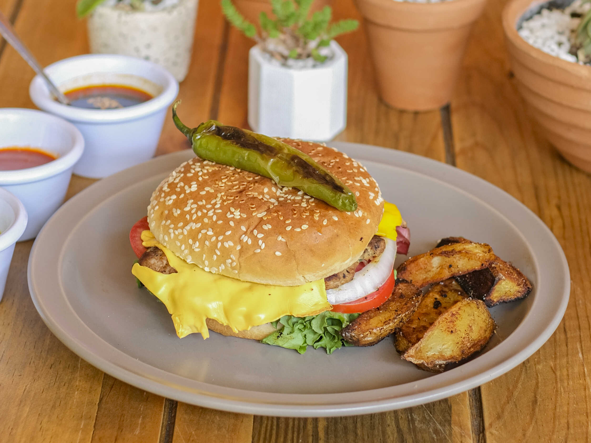 Cheeseburguer con carne clásica, acompañada de una mezcla de quesos: amarillo, panela y oaxaca. Completa con jitomate fresco, cebolla, lechuga italiana, y un toque de mayonesa. Acompañada de papas.