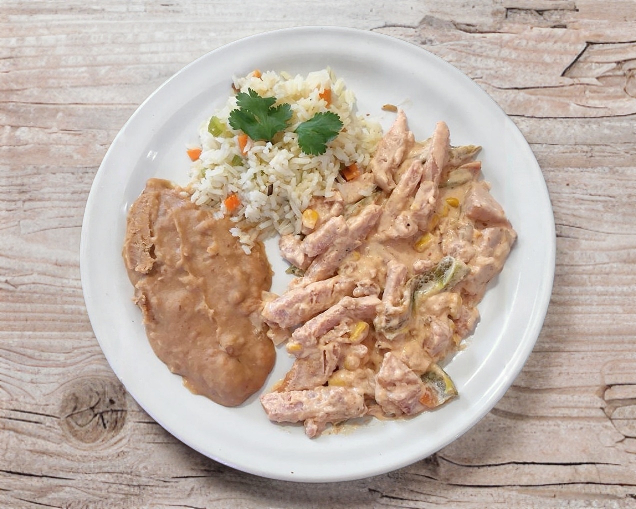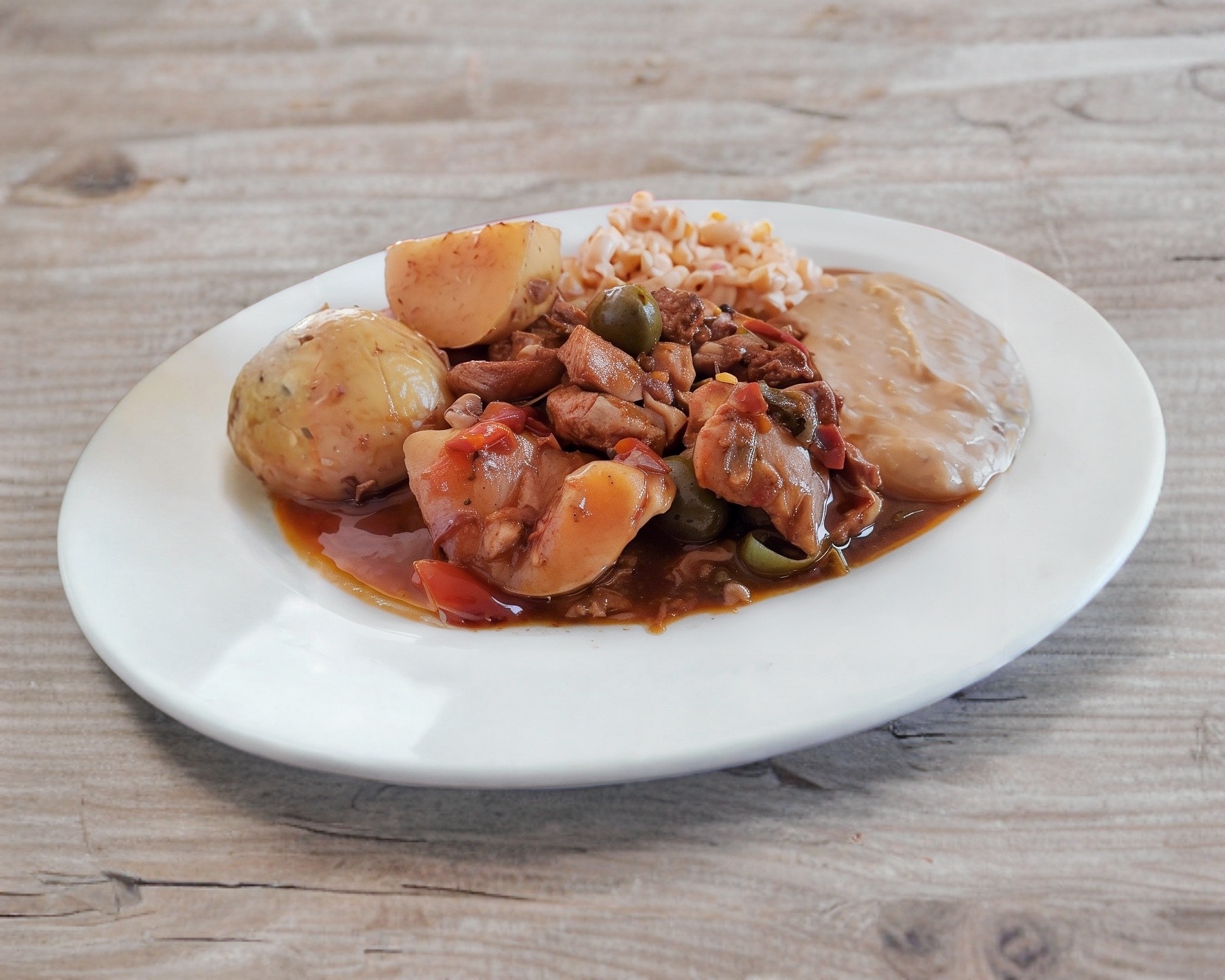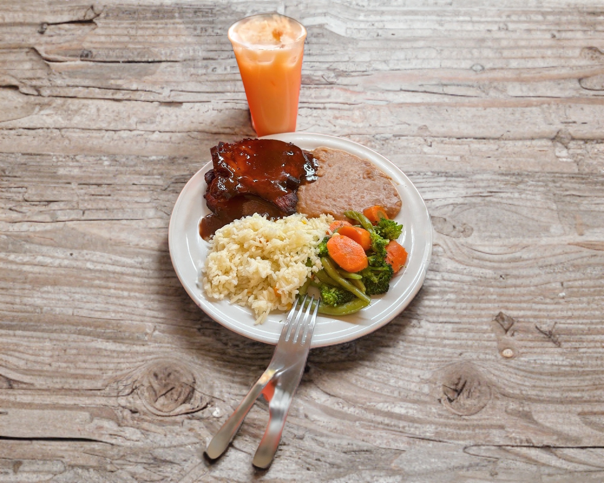 Chuletas en BBQ acompañadas de arroz, frijol y verduras.