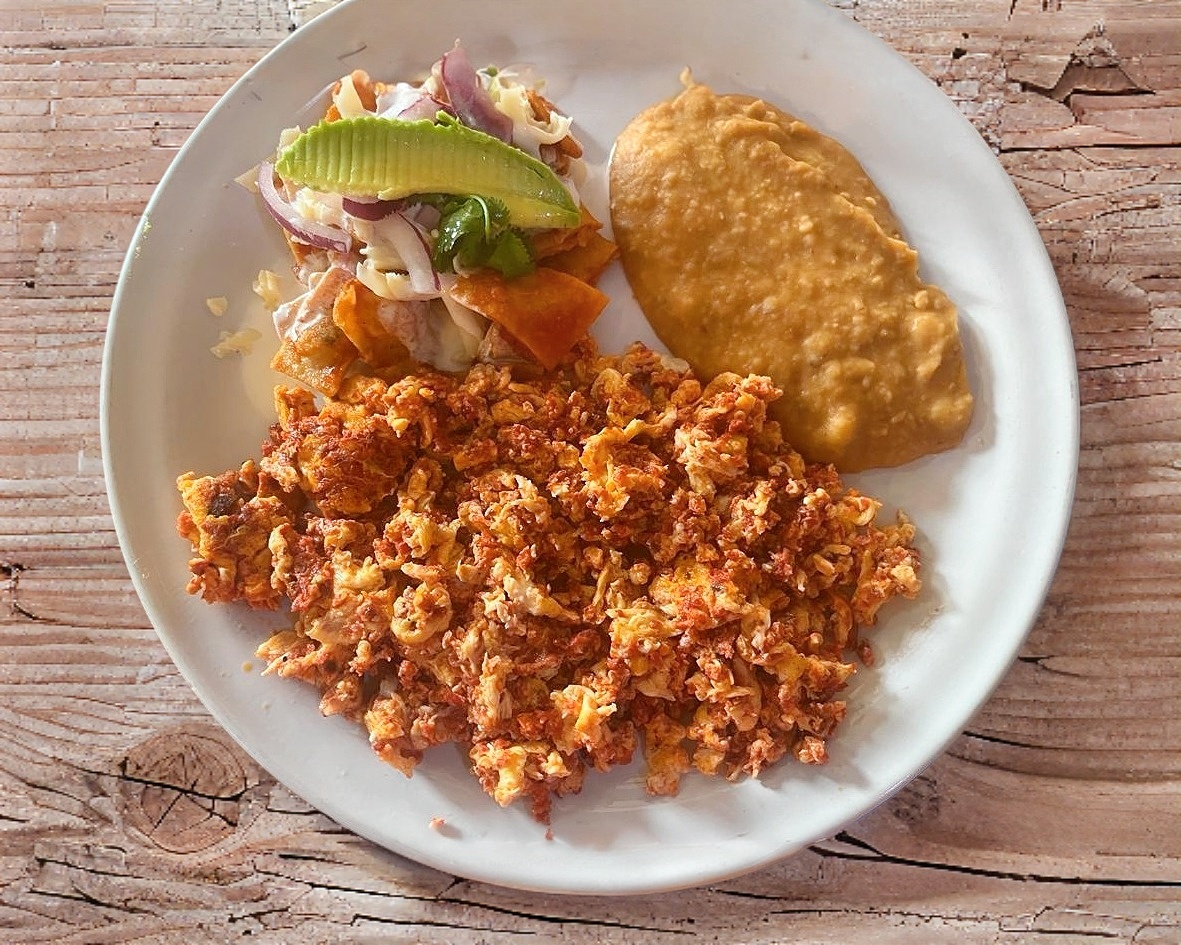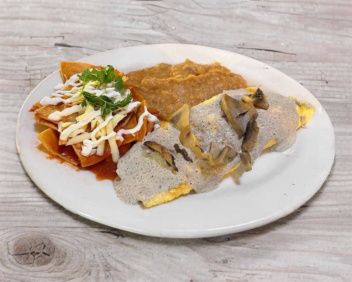 Omelette al gusto, acompañado de chilaquiles y frijoles.
