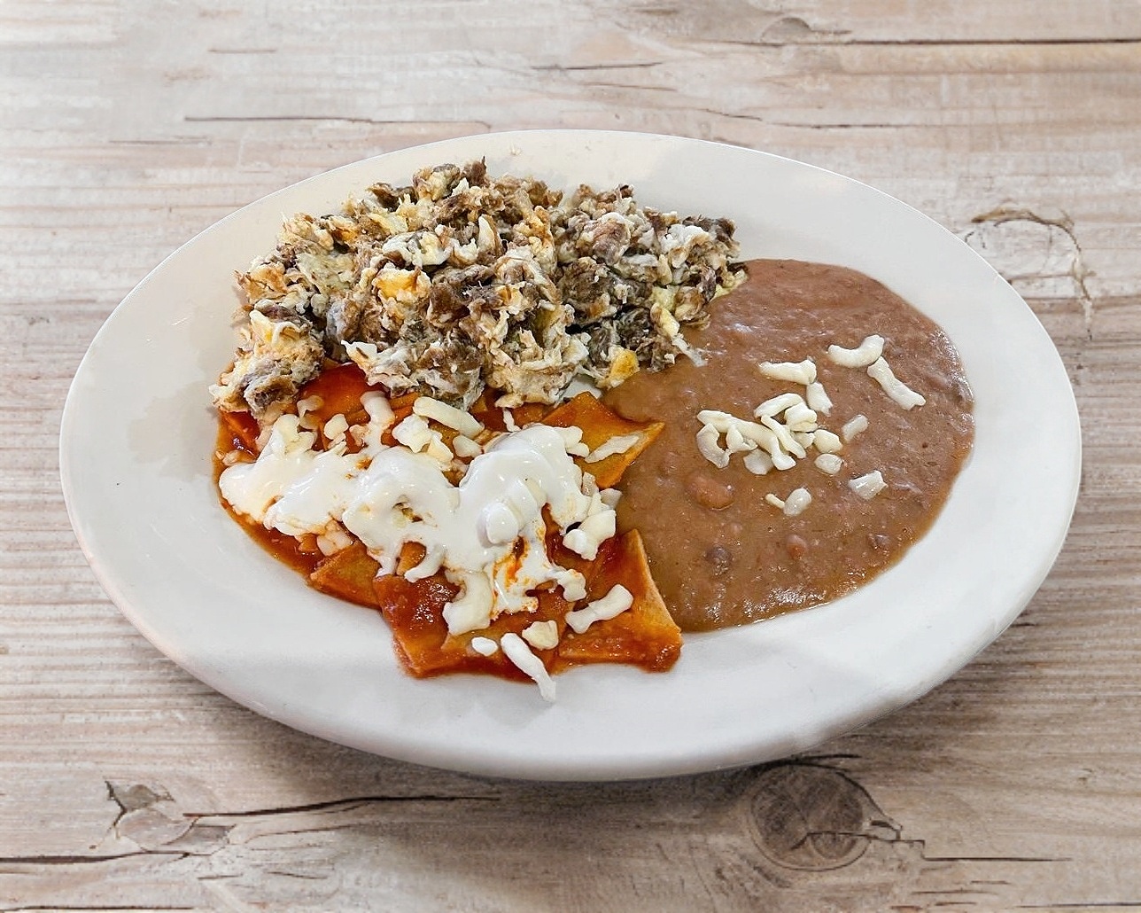 Machaca con verdura, acompañado de chilaquiles y frijoles.